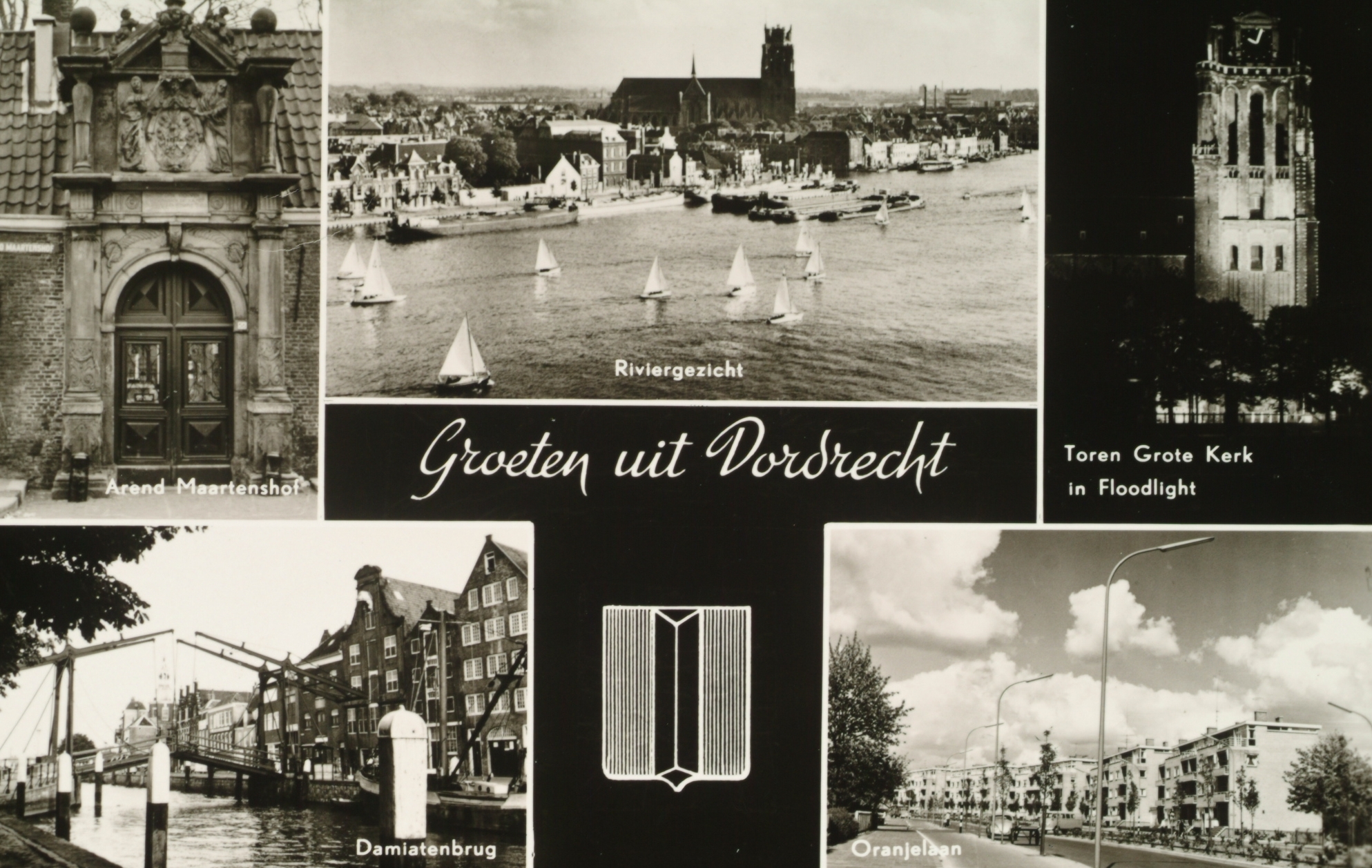 LB-Poort Arend Maartenshof. RB-Grote Kerk. LO-Damiatebrug. RO-Oranjelaan.