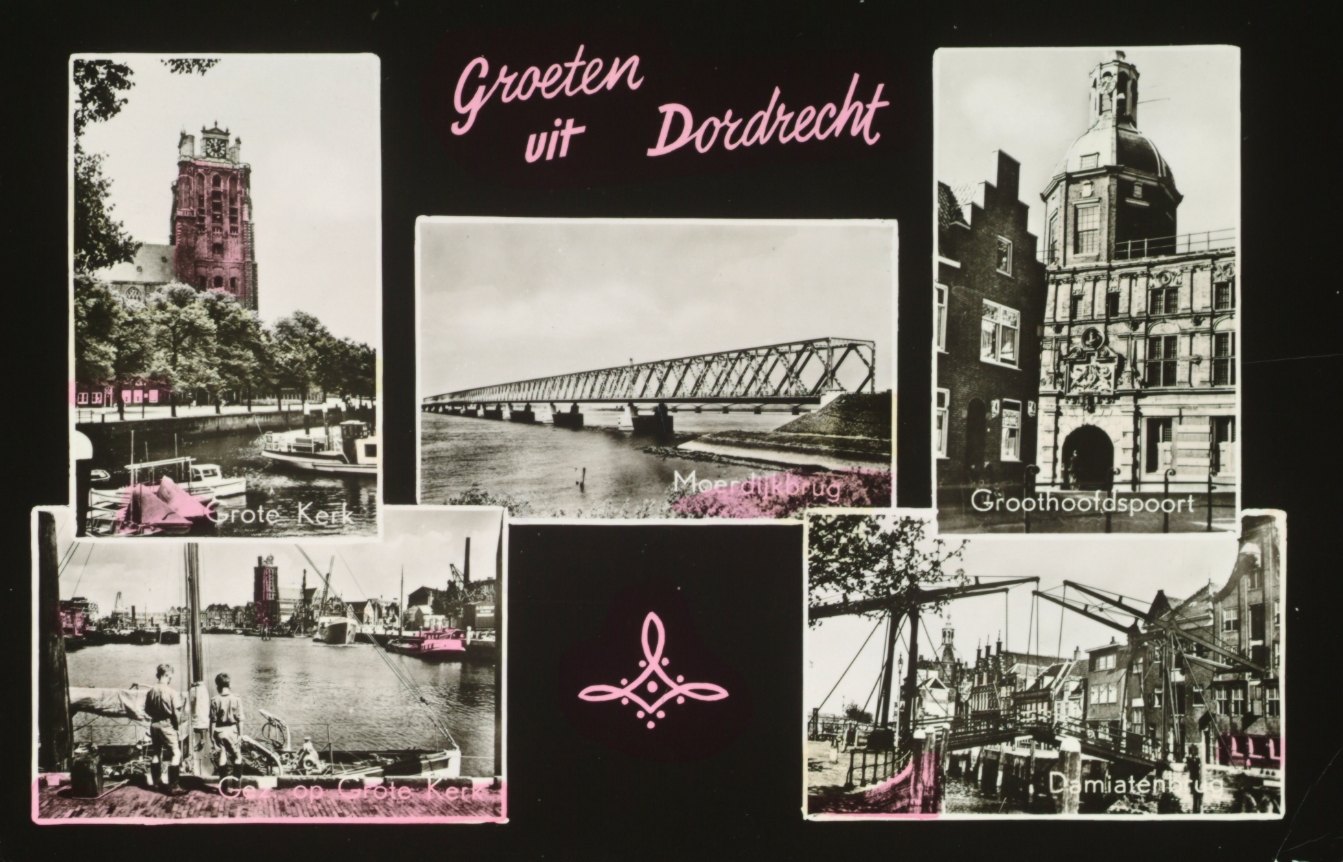 LB-Maartensgat met Grote Kerk. RB-Groothoofdspoort. LO-Kalkhaven met Grote Kerk. RO-Damiatebrug. M-Moerdijkbrug.
