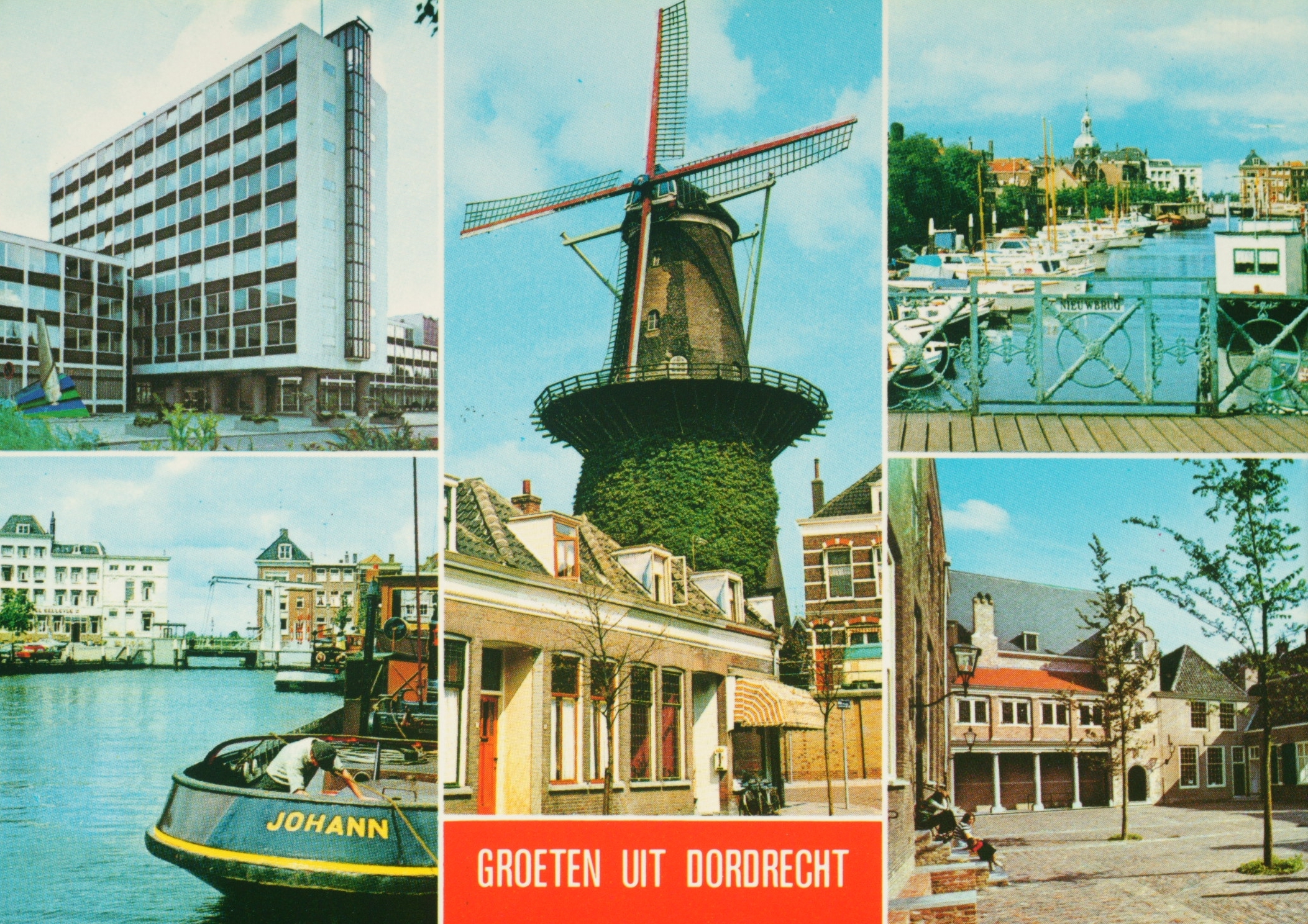 LB-Stadskantoor. LO-Wijnhaven met Boombrug. MI-Molen Kijk over de Dijk. RB-Wijnhaven met het Groothoofd op de achtergrond. RO-Het Hof.