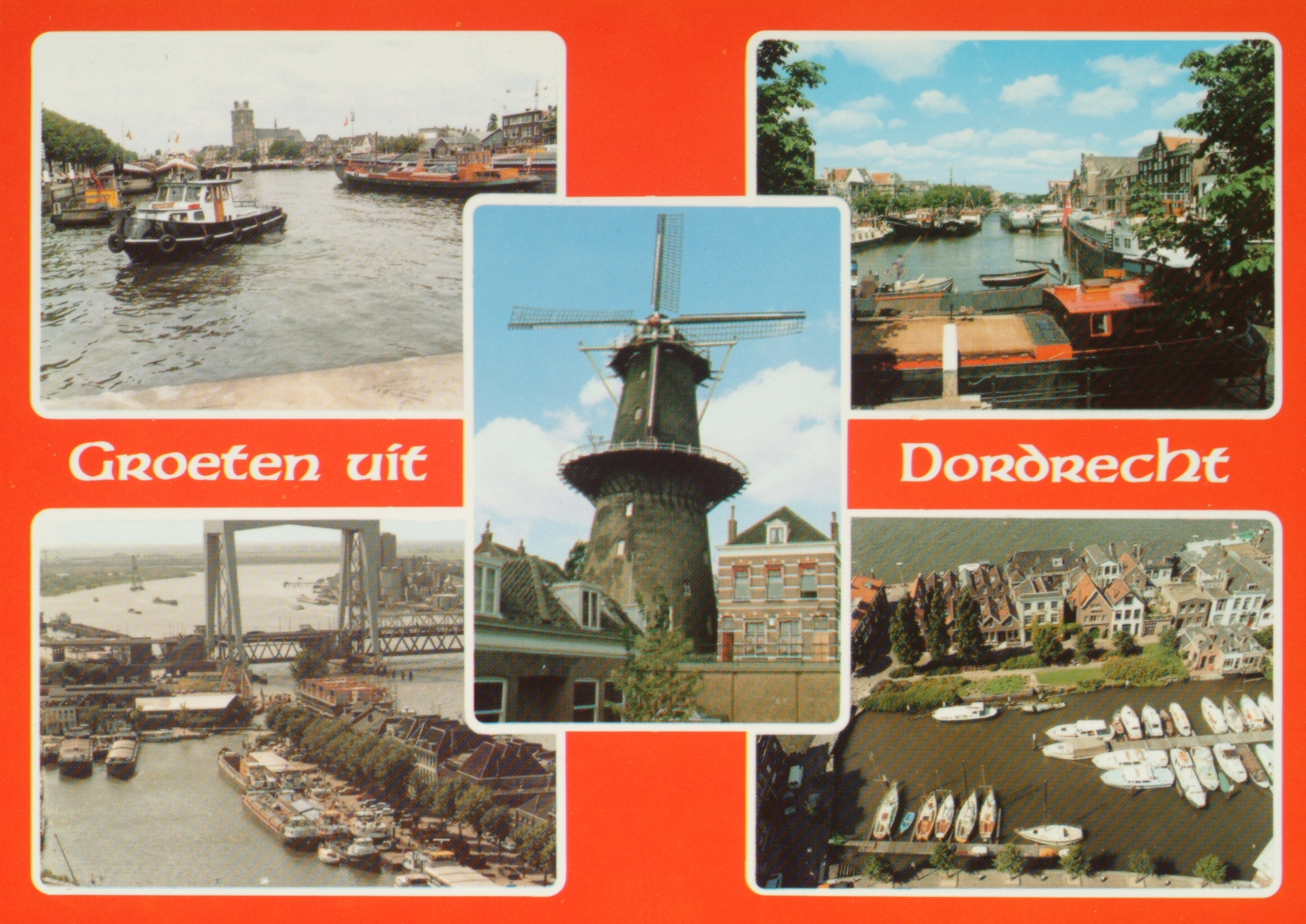 LB-Nieuwe Haven met Grote Kerk. RB-Wolwevershaven. LO-Vanaf toren Grote Kerk zicht op de Oude Maas. RO-Vanaf toren Grote Kerk zicht op het Maartensgat. MO-Molen Kijk over de Dijk.