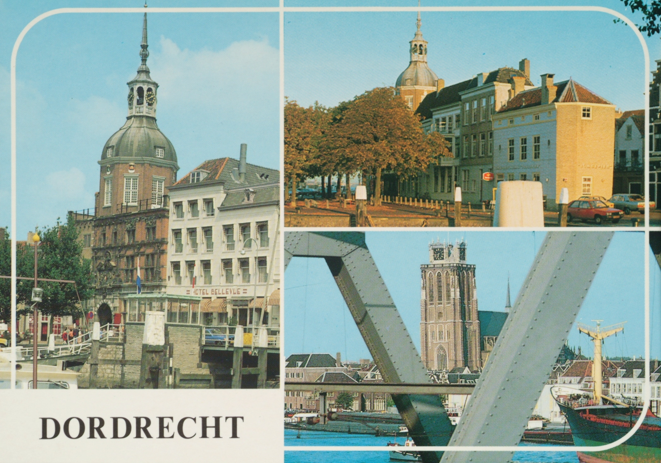 L-Groothoofd met Hotel Bellevue. RB-Groothoofd gezien vanaf het Damiate Bolwerk. RO-grote Kerk vanaf de brug over de Oude Maas.
