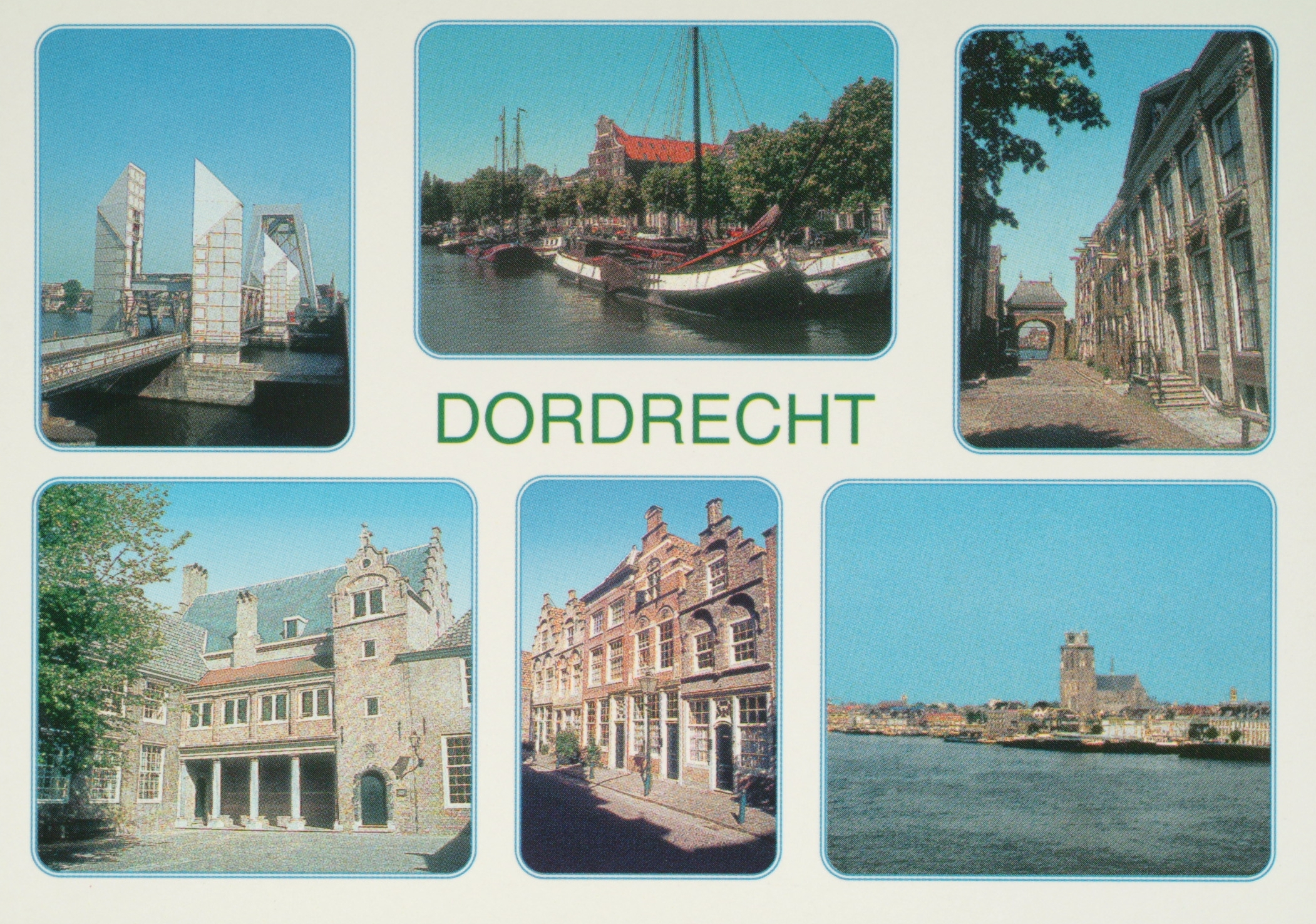 LB-Spoorbrug gezien vanaf Zwijndrecht. MB-Wolwevershaven met pakhuis Stockholm. RB-Korte Engelenburgerkade met de Catharijnepoort. LO- Het Hof. MO-Hofstraat. RO-Vanaf Zwijndrecht zicht op de Grote Kerk in Dordrecht.