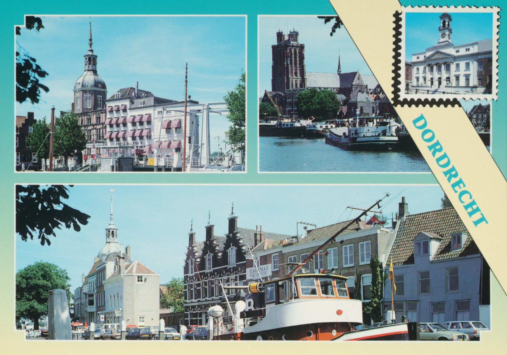 LB-Groothoofd met Hotel Bellevue. MB-Bomhaven met Grote Kerk. RB-Stadhuis. Onder Kuipershaven met het Groothoofd.