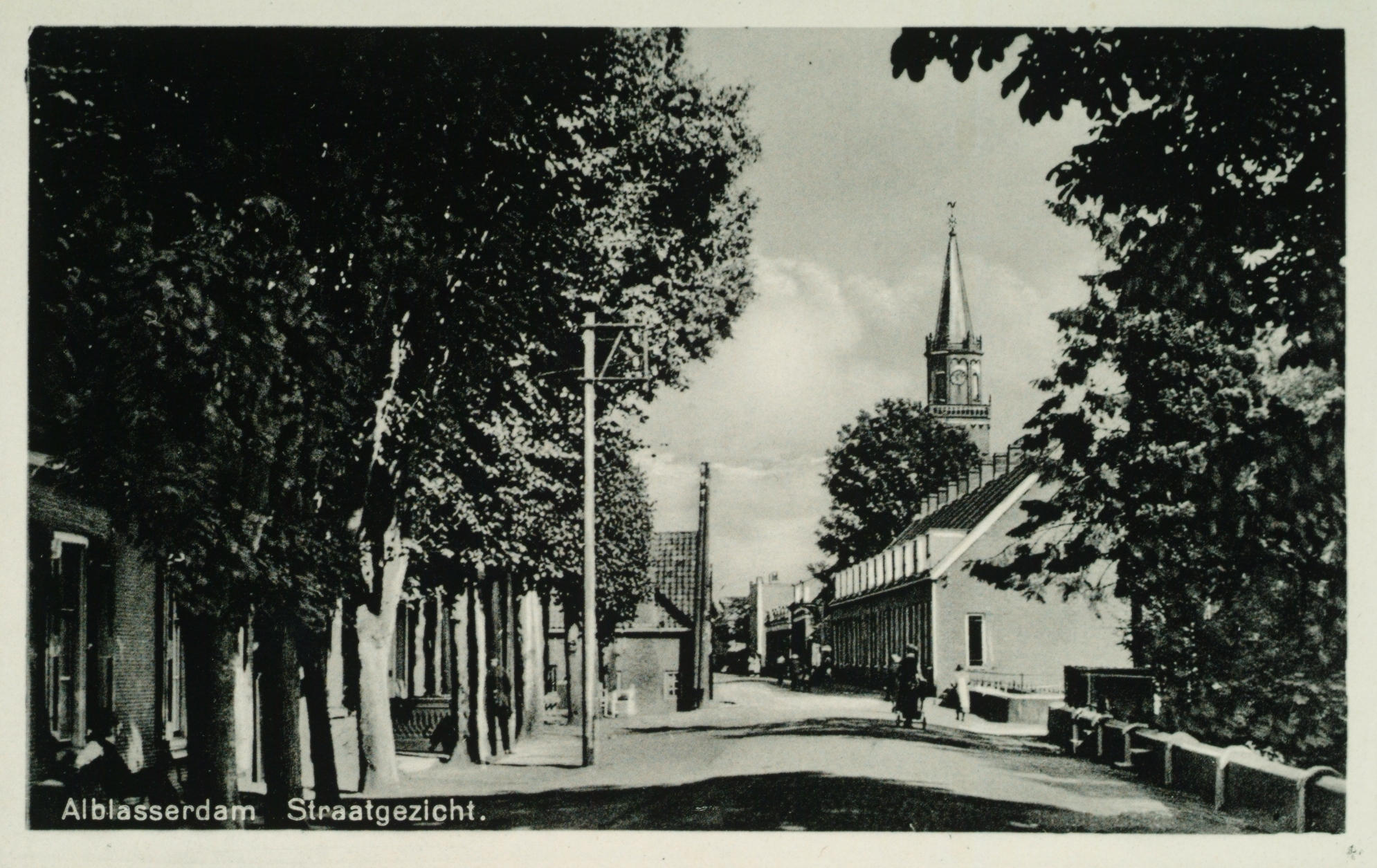 - Het Cortgene in oostelijke richting en de Grote Kerk in Alblasserdam. Rechts voor de rij woningen was de ingang naar de de Oude Werf.