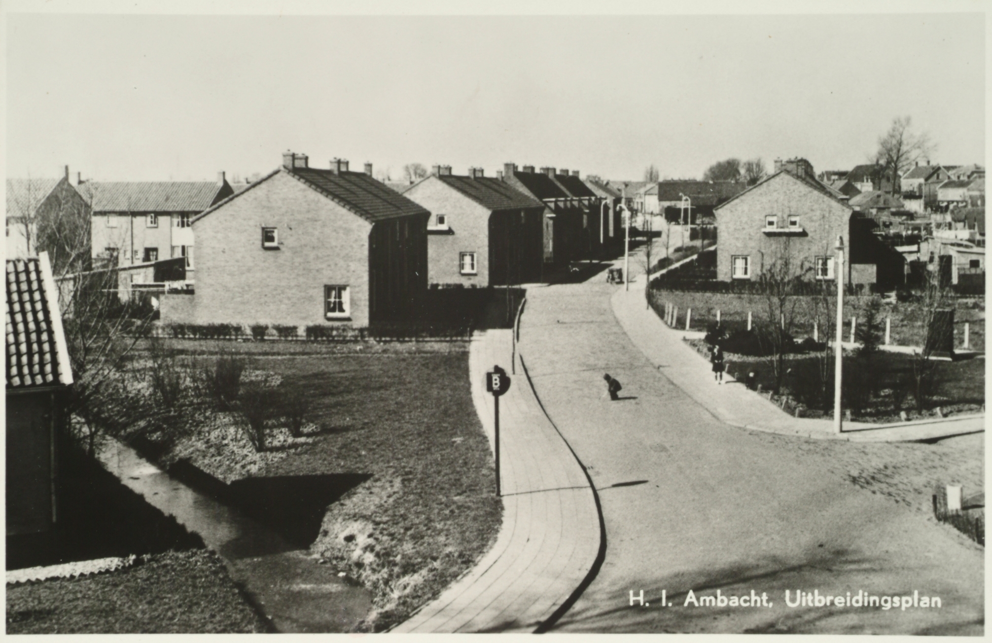 Lindestraat vanaf de Veersedijk. Ik kan hier geen rechtstreekse link plaatsen, maar op facebook is het wel te vinden (HIAmbacht, Linestraat, herinrichting). Gebouwd ca. 1952-1954, bewoners moesten 2004 hun huis uit voor de sloop. Deze opname is kort na de bouw, de brandweerkazerne 552_454415 iets verderop is nog niet gebouwd (toren zou dan hier zichtbaar zijn) en die dateert eind jaren ‘50. Het huis rechtsachter, Veersedijk 32, is er nog wel, maar nauwelijks specifiek herkenbaar.