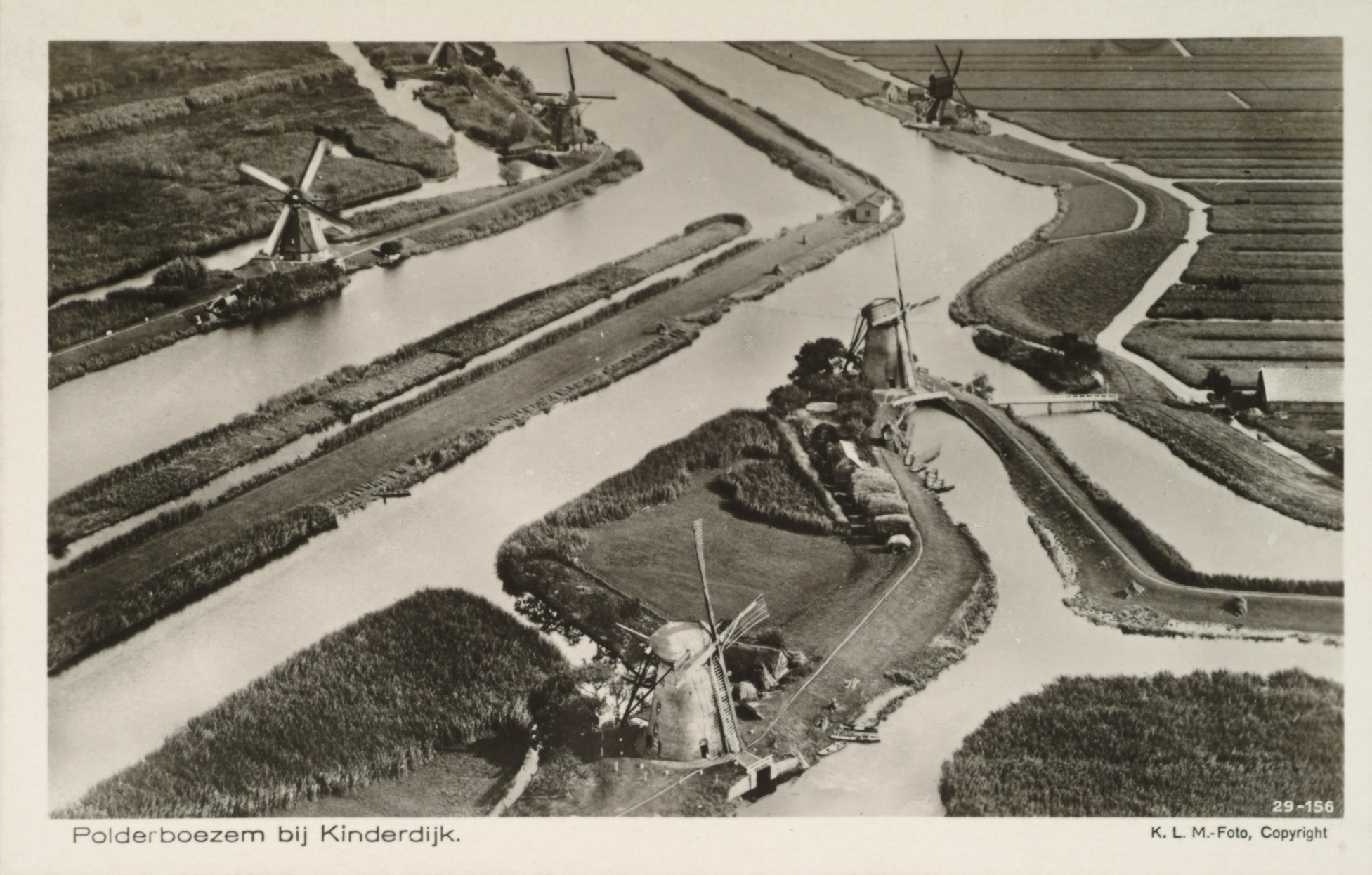 Luchtfoto van molens in Kinderdijk. Midden onder naar boven: Nederwaard No 4, …