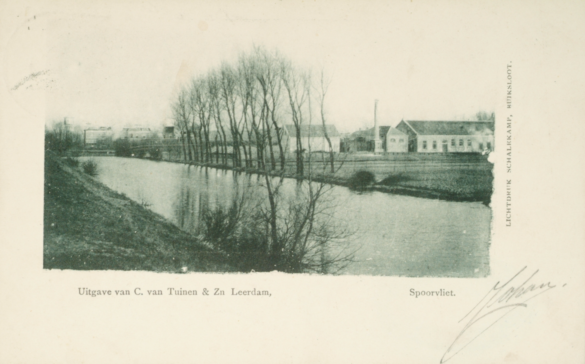 - De Spoorvliet in Leerdam.Links op de achtergrond de watertoren aan het Oud Schalk. Rechts de boter-, kaas- en eierenfabriek.
