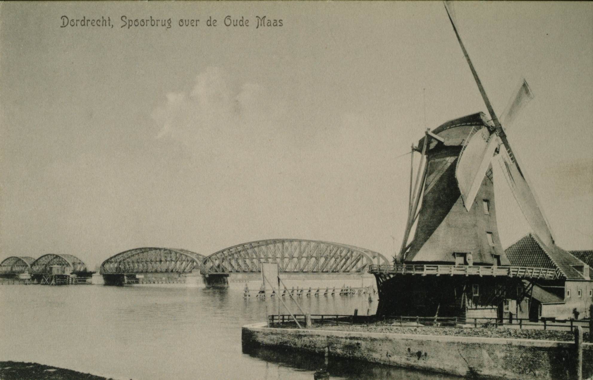 - De spoorbrug over de Oude Maas, gezien bij molen De Zeelt aan de monding van de Spoorweghaven.