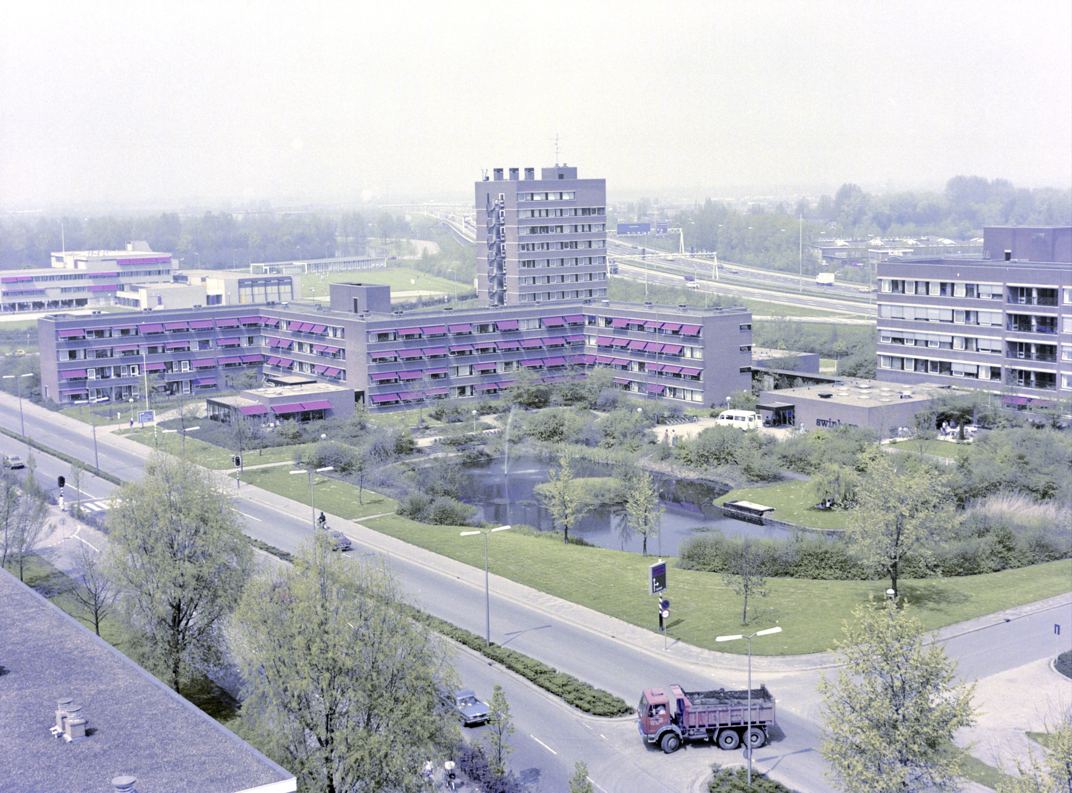 - Verzorgingstehuis Swinhove, gezien vanuit de hoge flat aan de Roosstraat over de Plantageweg in Zwijndrecht in de richting van Rijksweg A16.