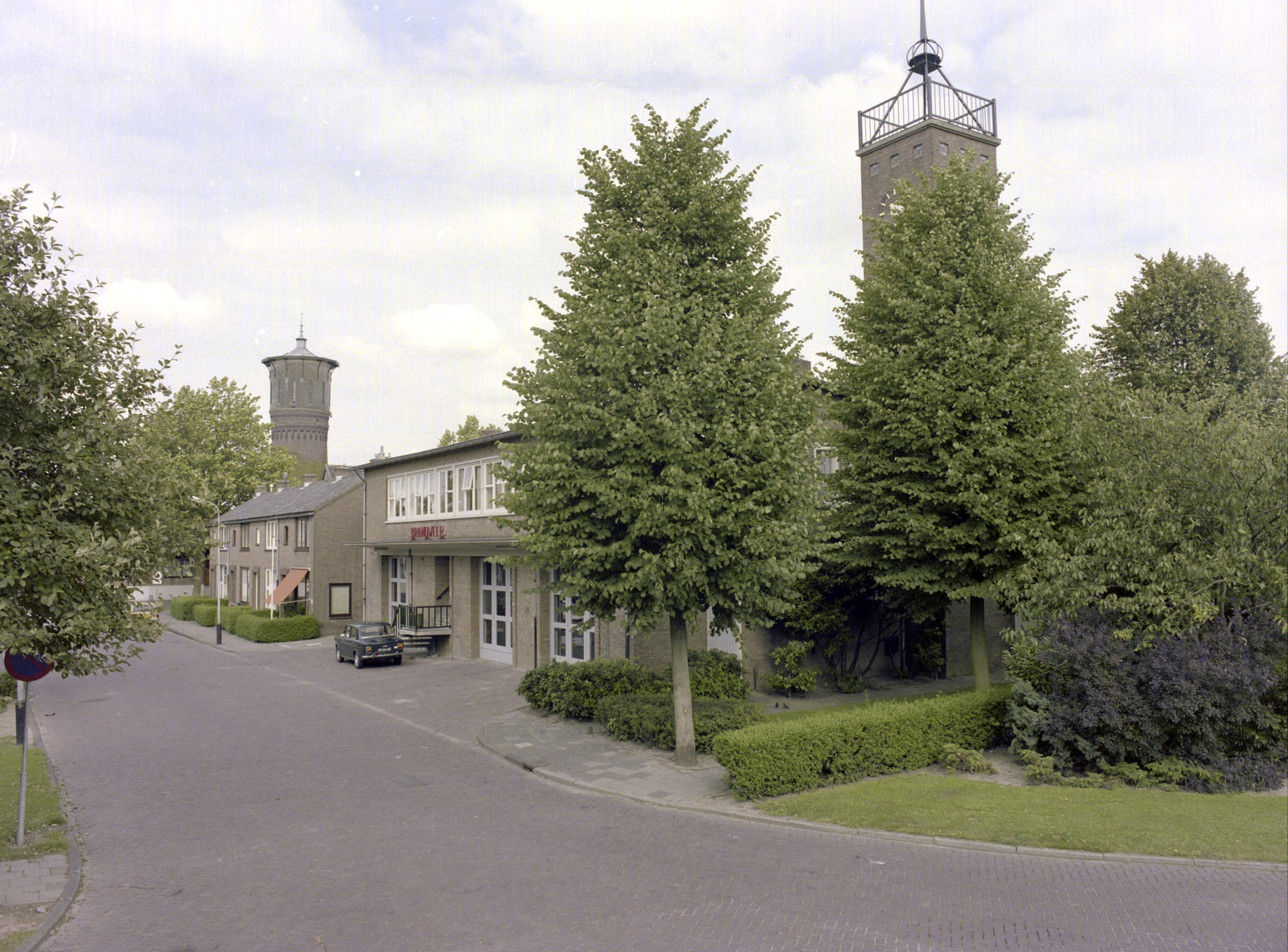 Brandweergebouw in de Jan van der Heydenstraat, verderop de watertoren in …