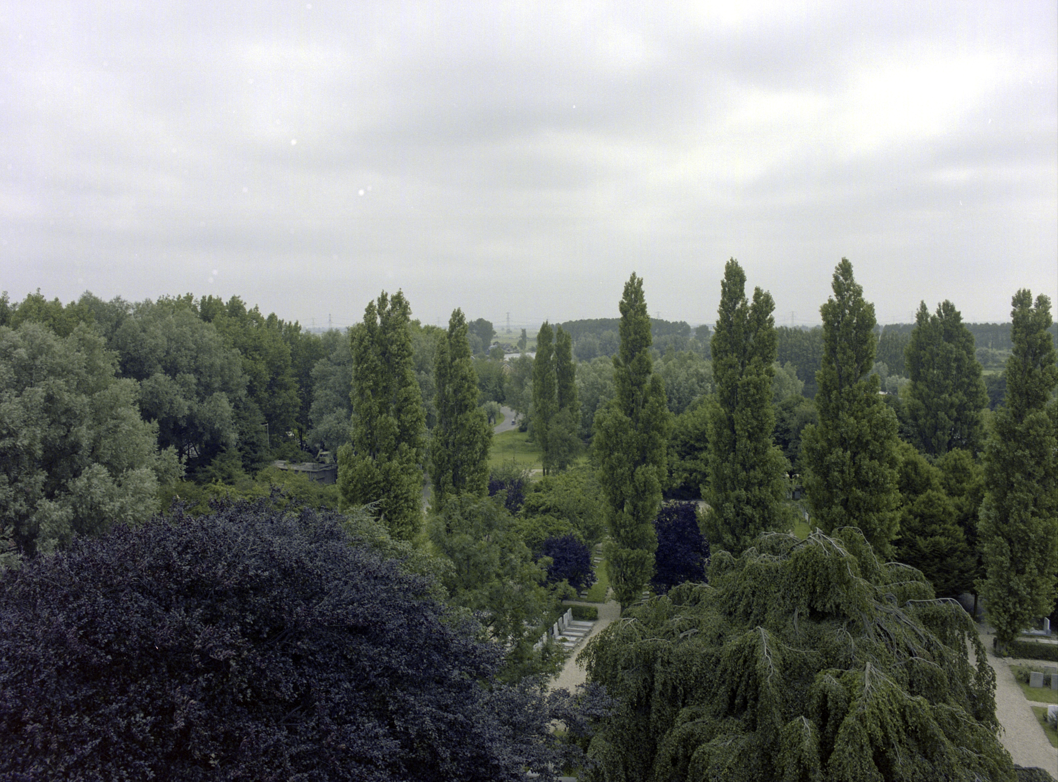 - Panorama vanaf de Oude Toren aan de Kerkstraat in Alblasserdam over de begraafplaats, naar het oosten gezien.