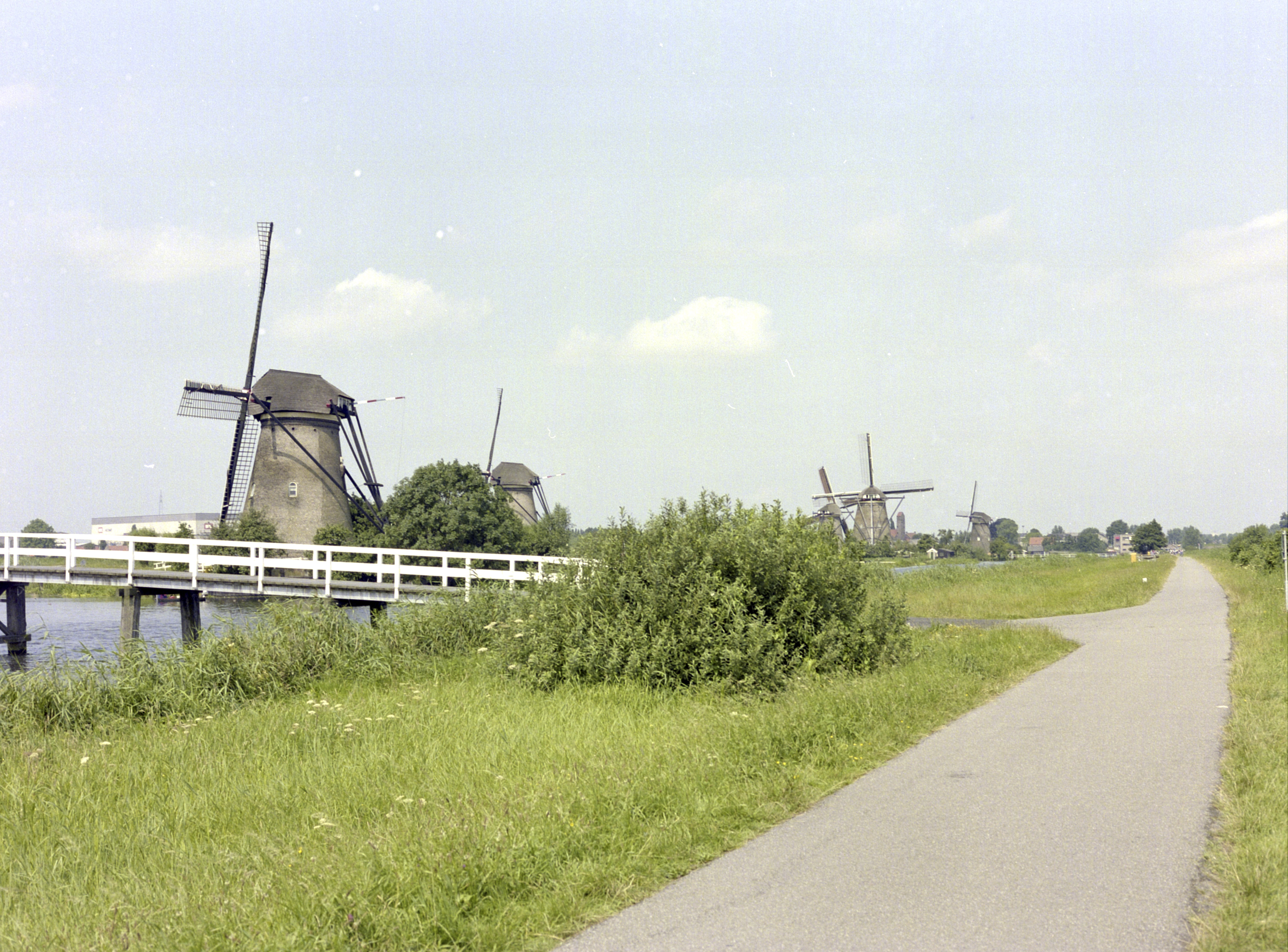 - Links Molen Nederwaard no. 5 bij de voetbrug tussen Molenkade Nederwaard en Blokweerschekade over Het Nieuwe Waterschap in Kinderdijk.