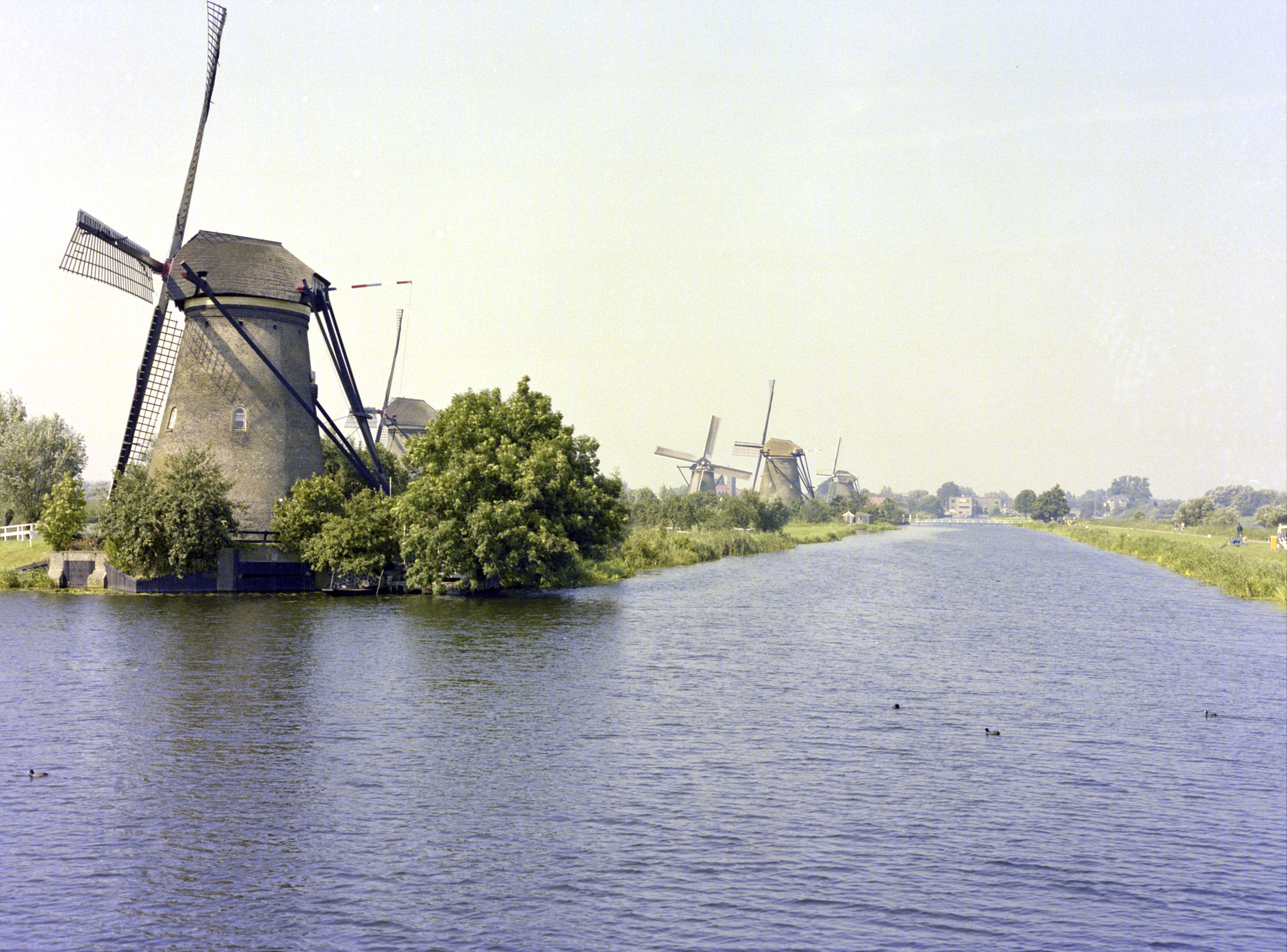 Links Molen Nederwaard no. 5 vanaf de voetbrug tussen Molenkade Nederwaard en Blokweerschekade over Het Nieuwe Waterschap in Kinderdijk.