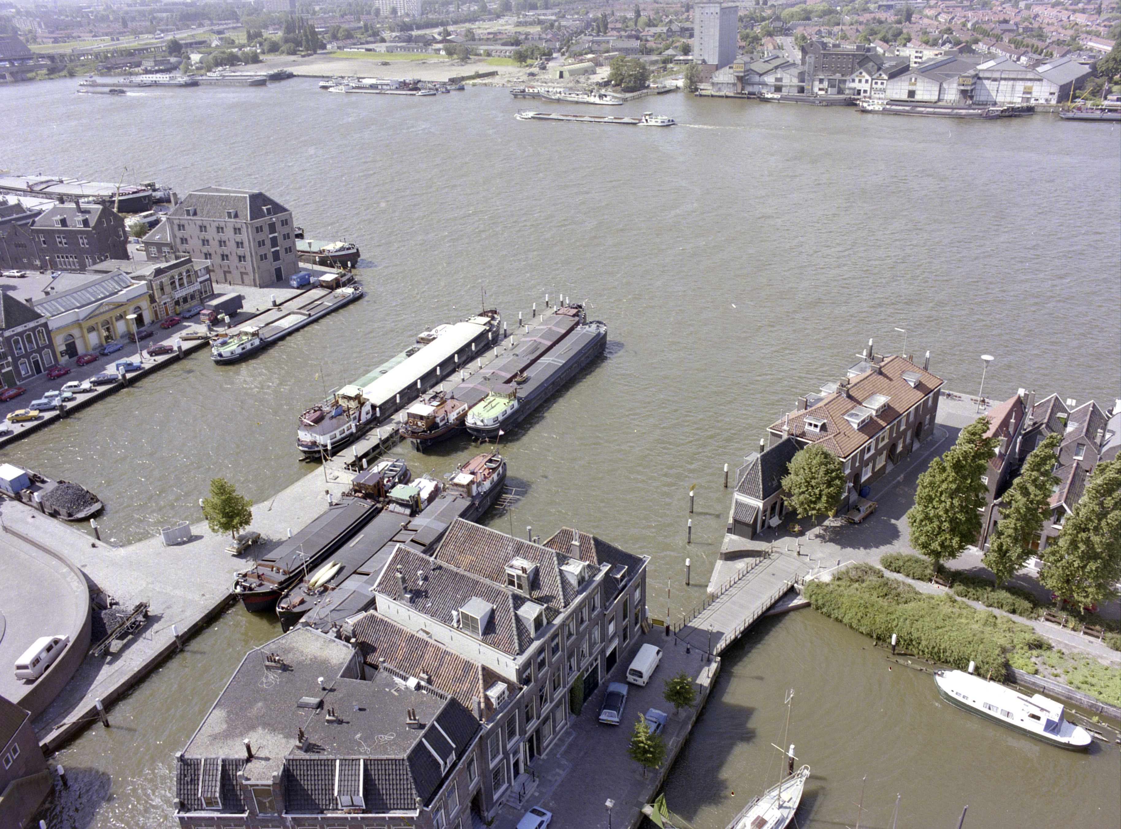 - Panorama vanaf de Grotekerkstoren over de Oude Maas naar Zwijndrecht. V.l.n.r. de Bomhaven, de Leuvehaven en het Maartensgat met de Mazelaarsbrug. Linksboven pakhuis Vredenburg op de hoek van de Bomkade en de Buiten Kalkhaven.