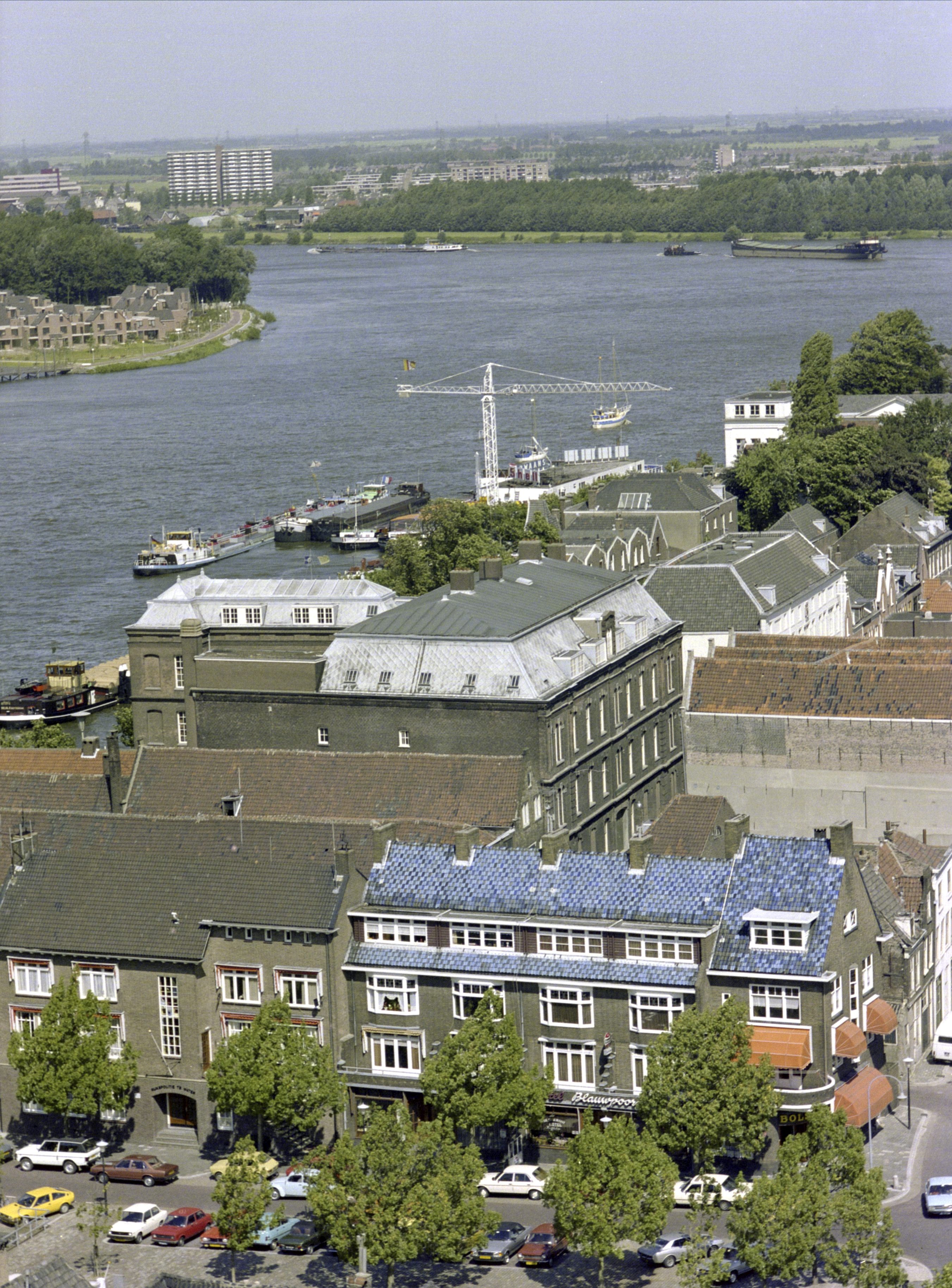 - Panorama vanaf de Grotekerkstoren over het Blauwpoortplein en verder richting Papendrecht.