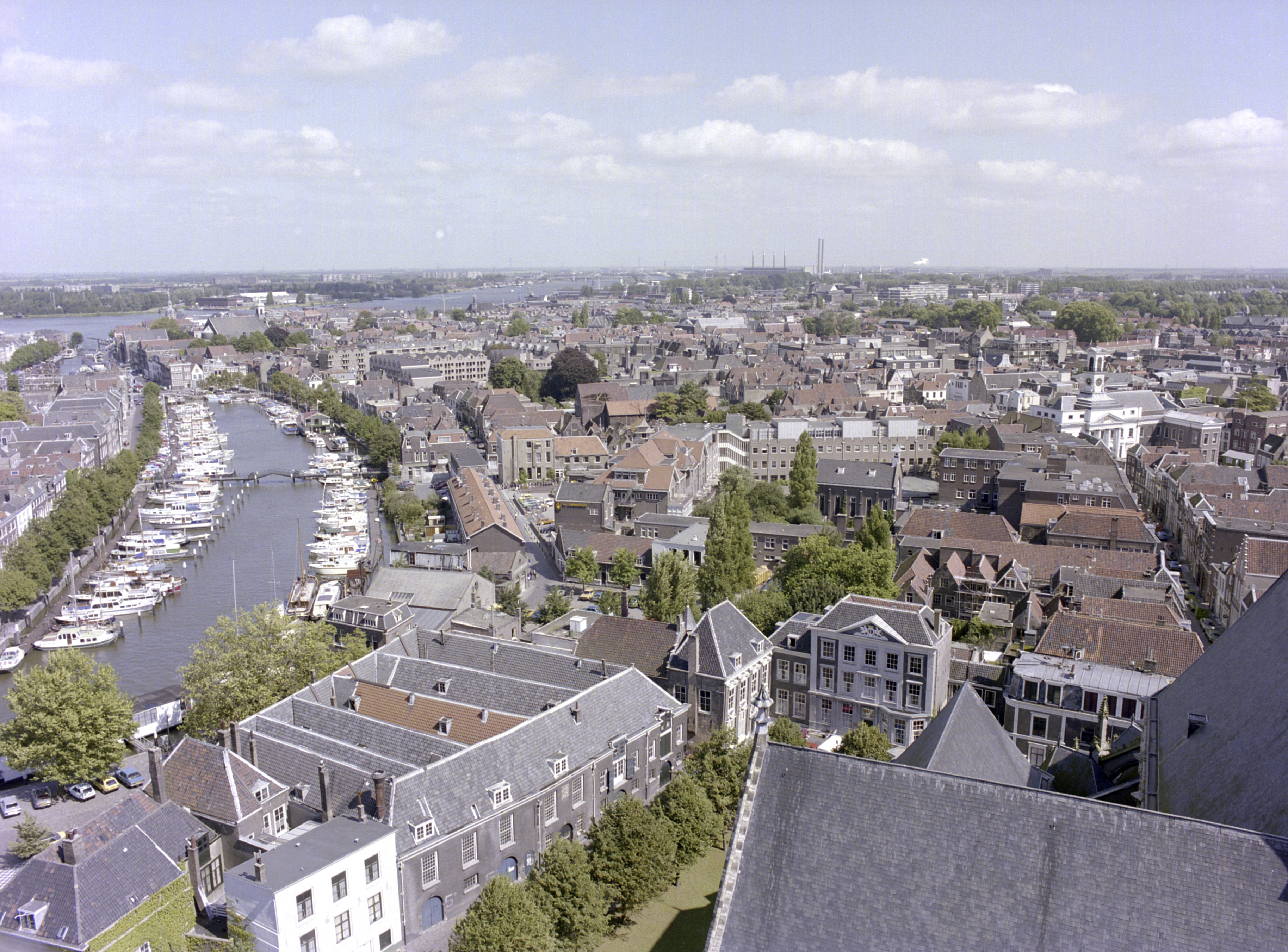 Vanaf de toren van de Grote Kerk in Dordrecht zicht op de Nieuwe Haven.