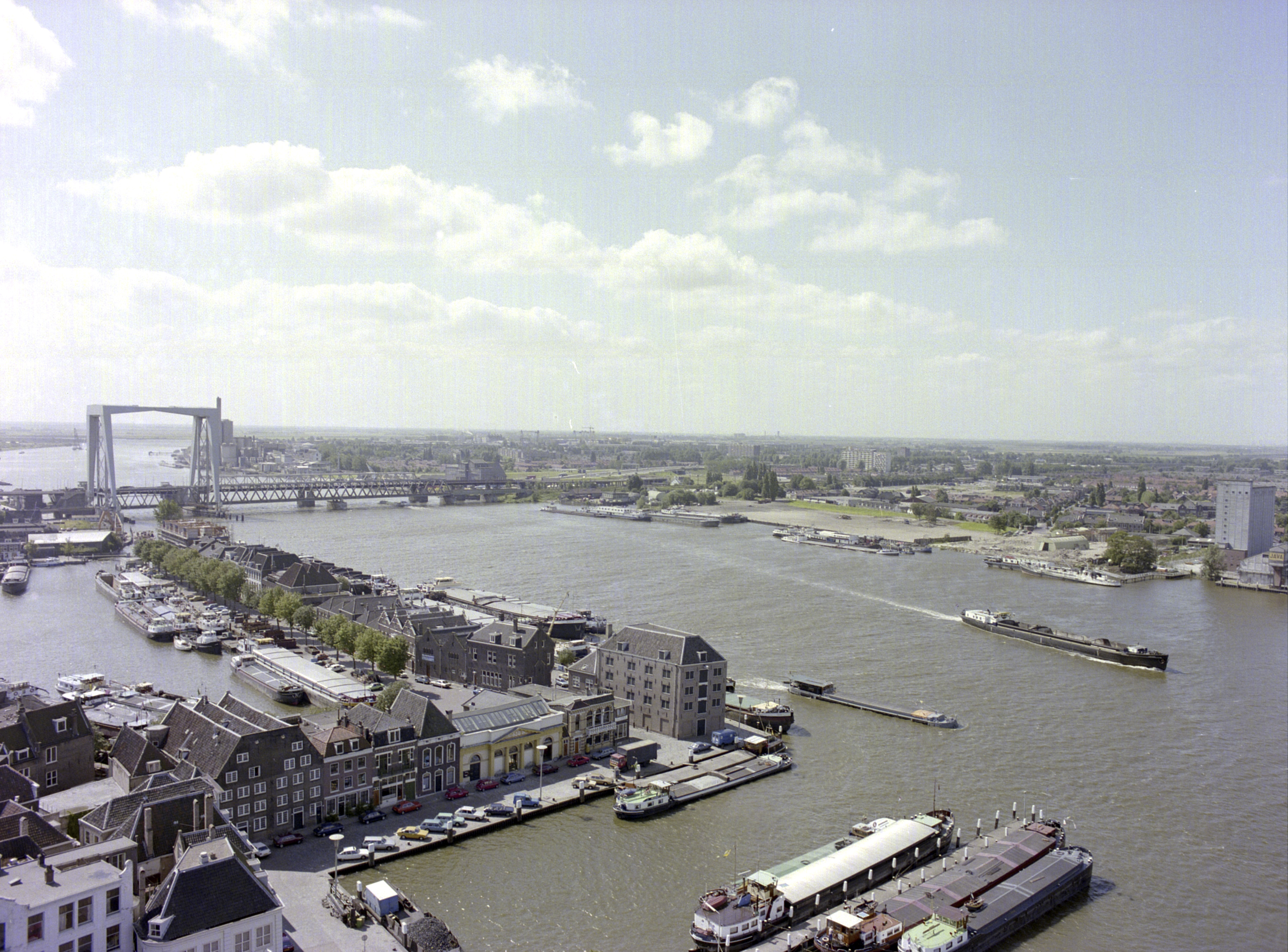 - Panorama vanaf Grotekerkstoren richting Bomhaven, Kalkhaven en bruggen over de Oude Maas.