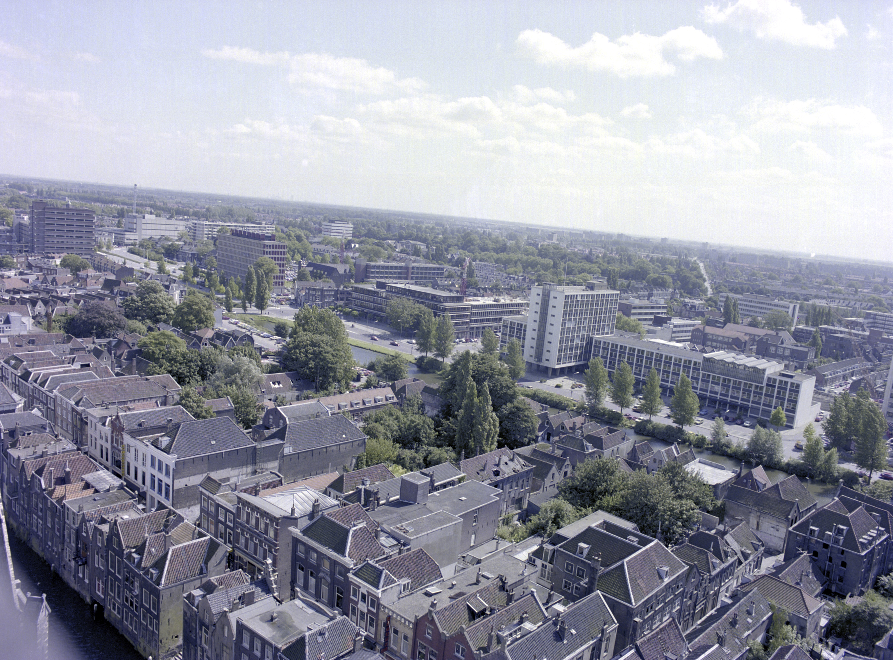 Panorama vanaf de Grotekerkstoren op de Spuiboulevard met rechts het stadskantoor. Linksonder de Voorstraat.