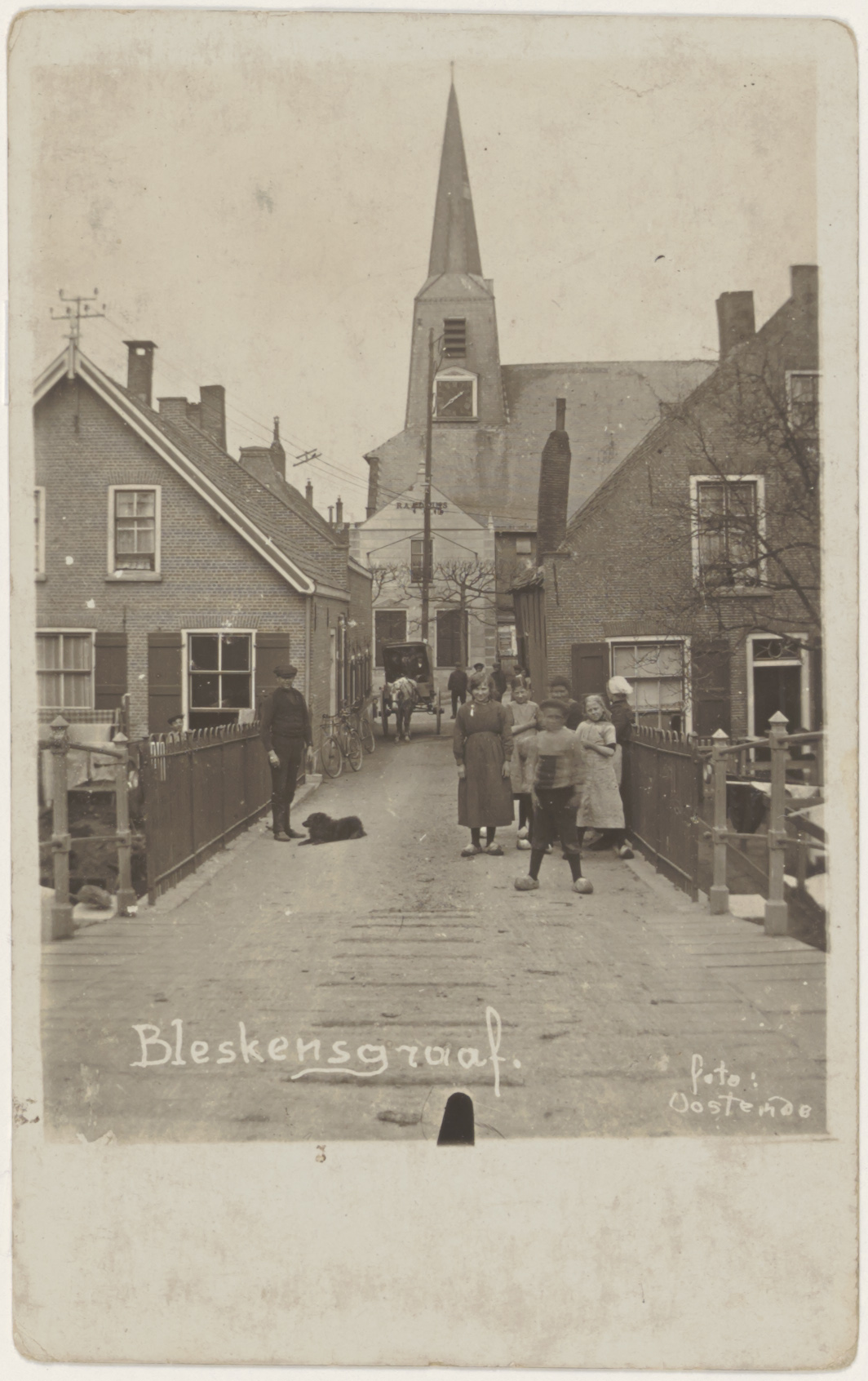 - Brug vanaf de Dorpsstraat over de Graafstroom naar de Kerkstraat met het raadhuis en de Hervormde Kerk in Bleskensgraaf. Kruidenierswinkel van Dirk van Oostende (rechts) en schoenmakerij Aantjes (links).