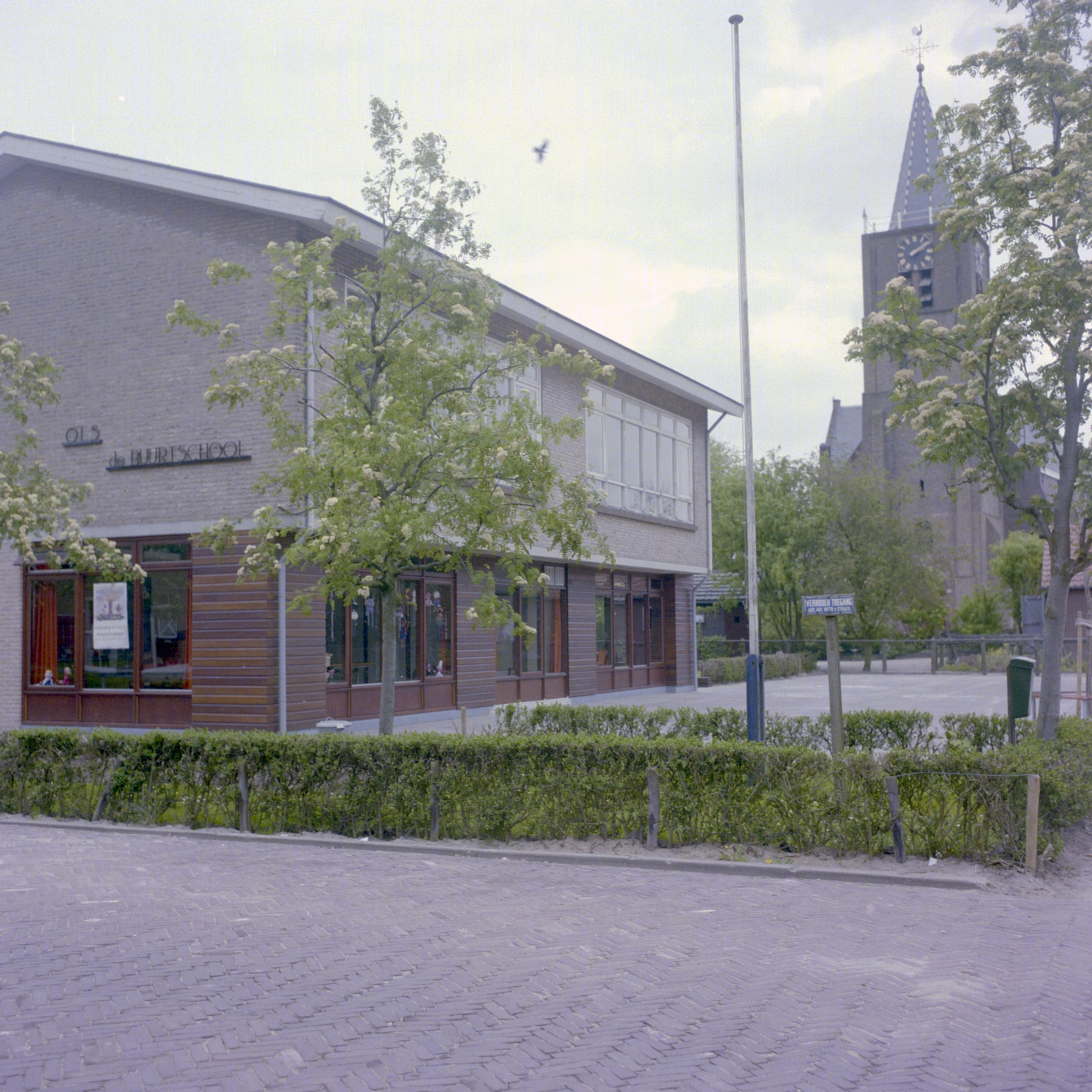 OLS De Buurtschool aan de M.J. Veder van Hobokenstraat in Noordeloos. De Bonifatiuskerk …