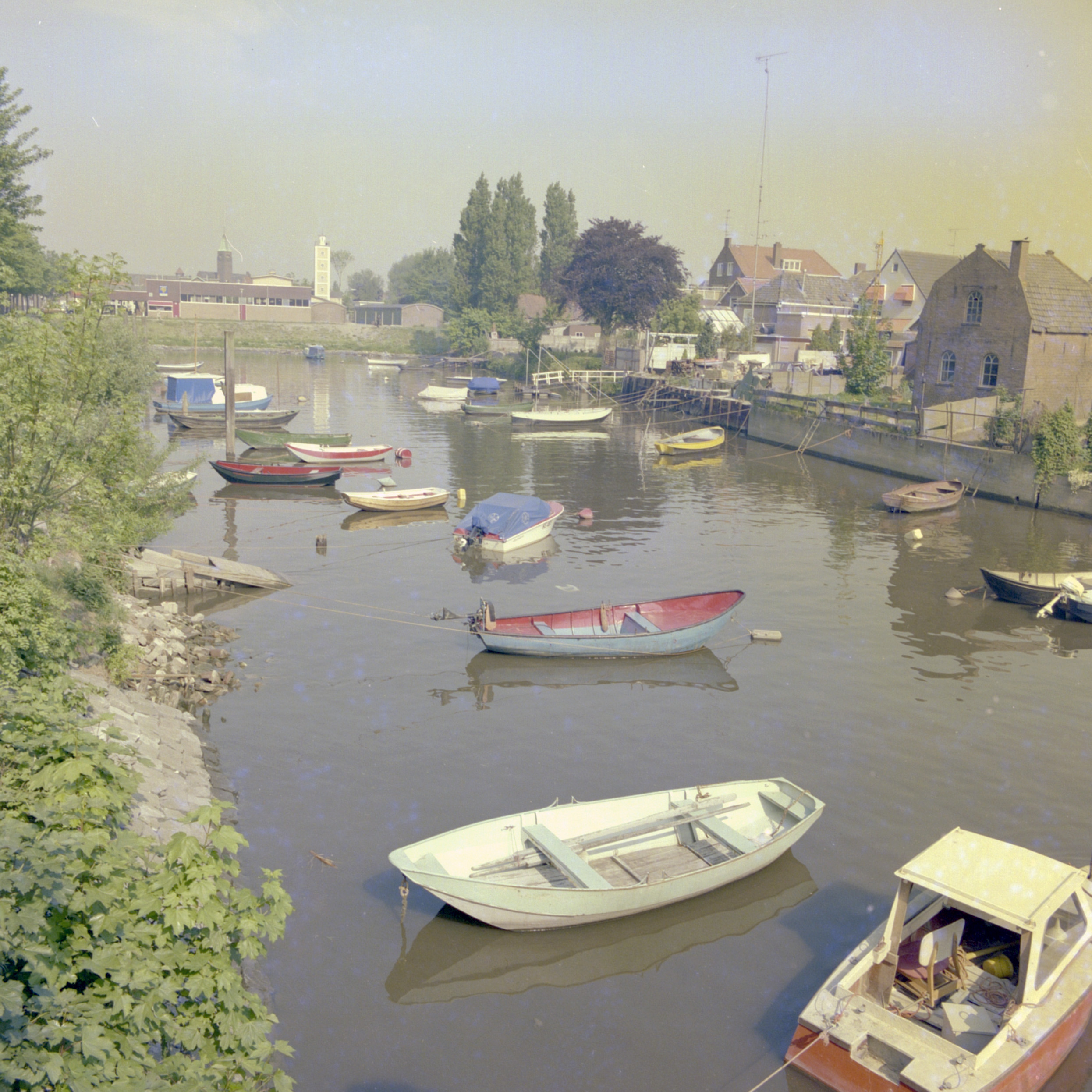 - Het Middeldiep in Sliedrecht, gezien richting Middeldiepstraat met de Gereformeerde Kerk en de droogtoren van de brandweerkazerne.