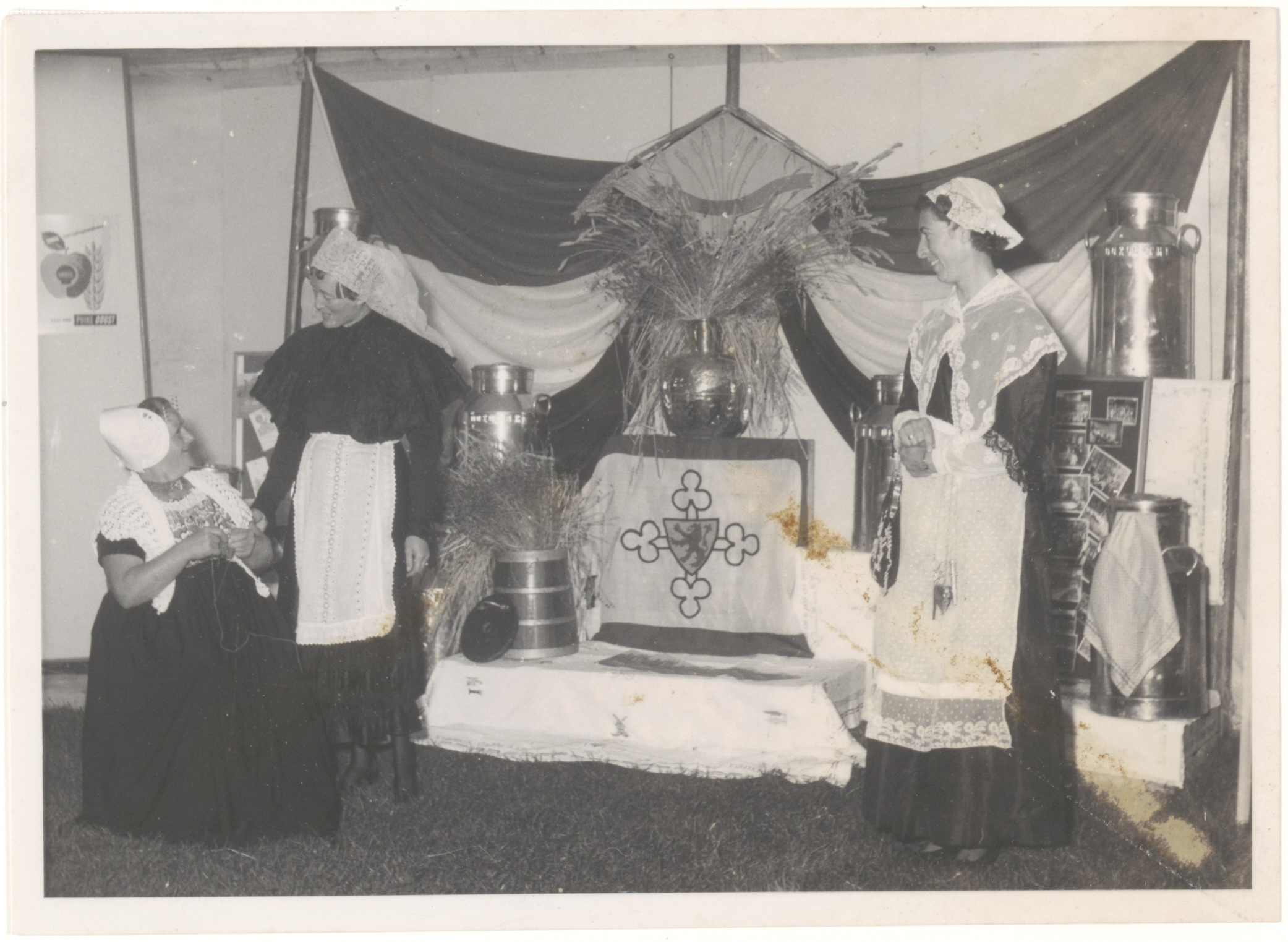 Drie vrouwen in klederdracht voor de stand van de Bond van Plattelandsvrouwen afdeling …