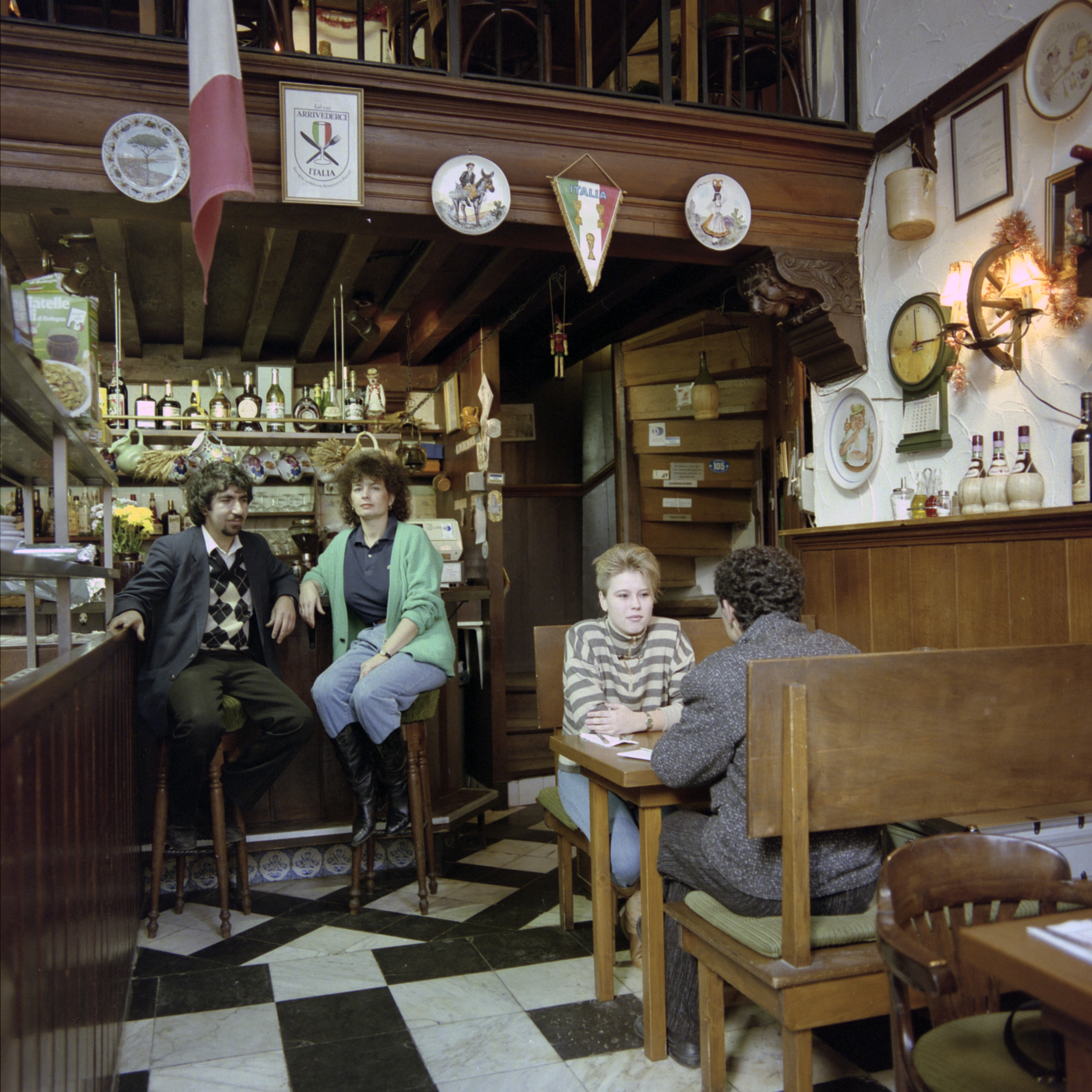 - Interieur van restaurant / pizzeria Picola Italia op de Voorstraat, hoek Wijnbrug.