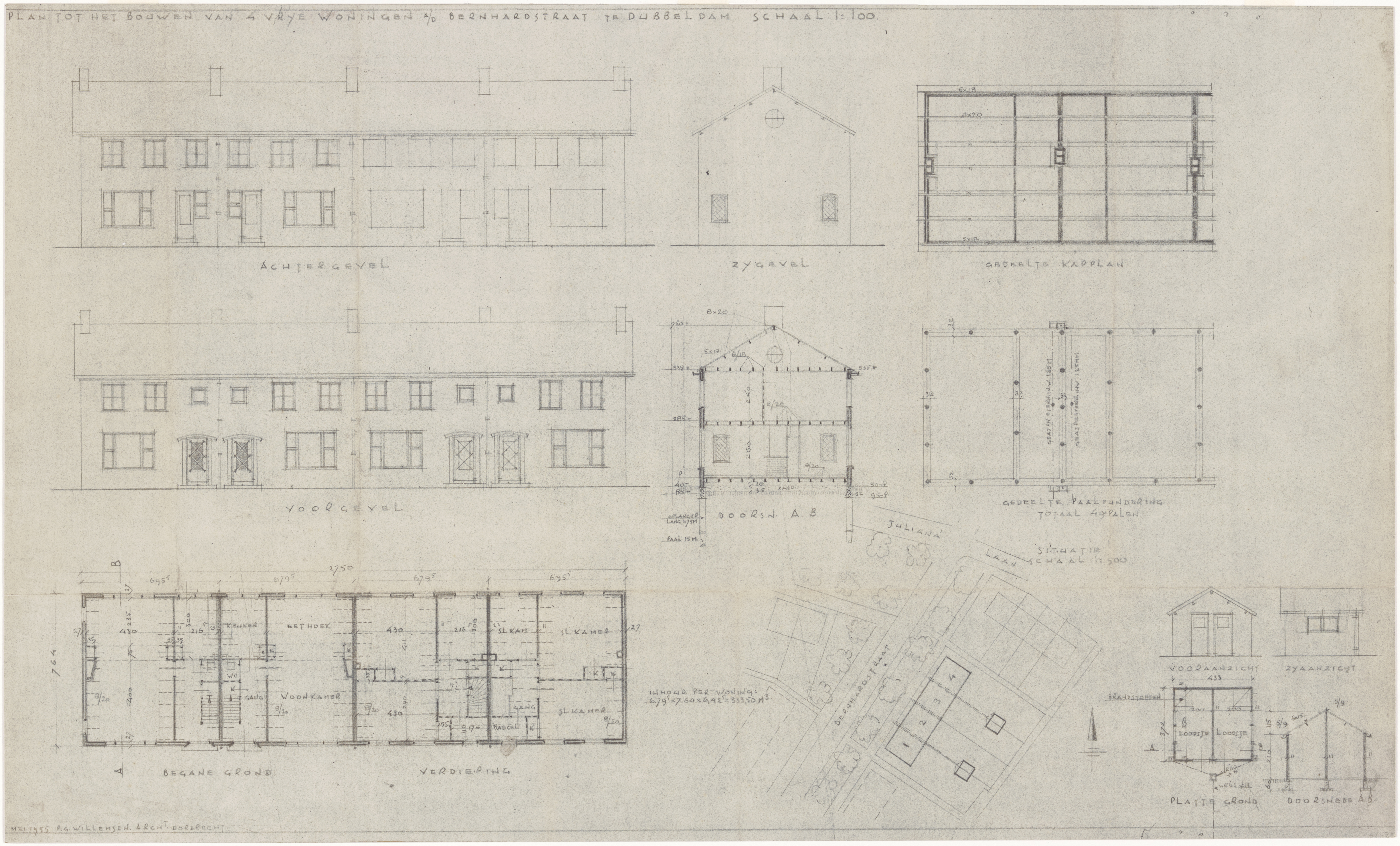 Plan voor de bouw van vier woningen aan de Bernhardstraat te Dubbeldam.