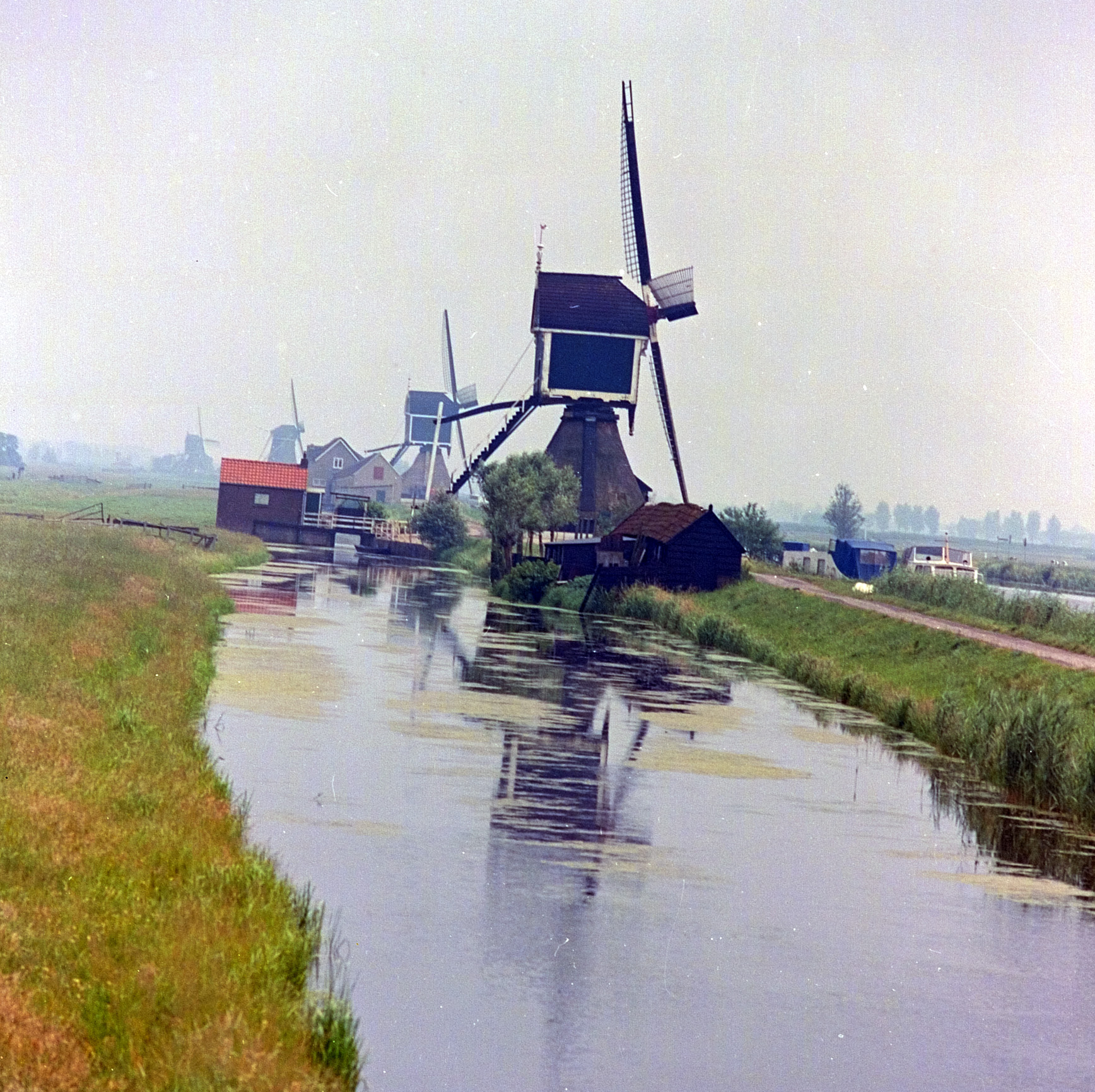 - Molenkade langs de Ammersche Boezem met van voor naar achter de Gelkenesmolen, Graaflandse molen, Achtkante molen en Achterlandse molen vanaf Groot-Ammers gezien.