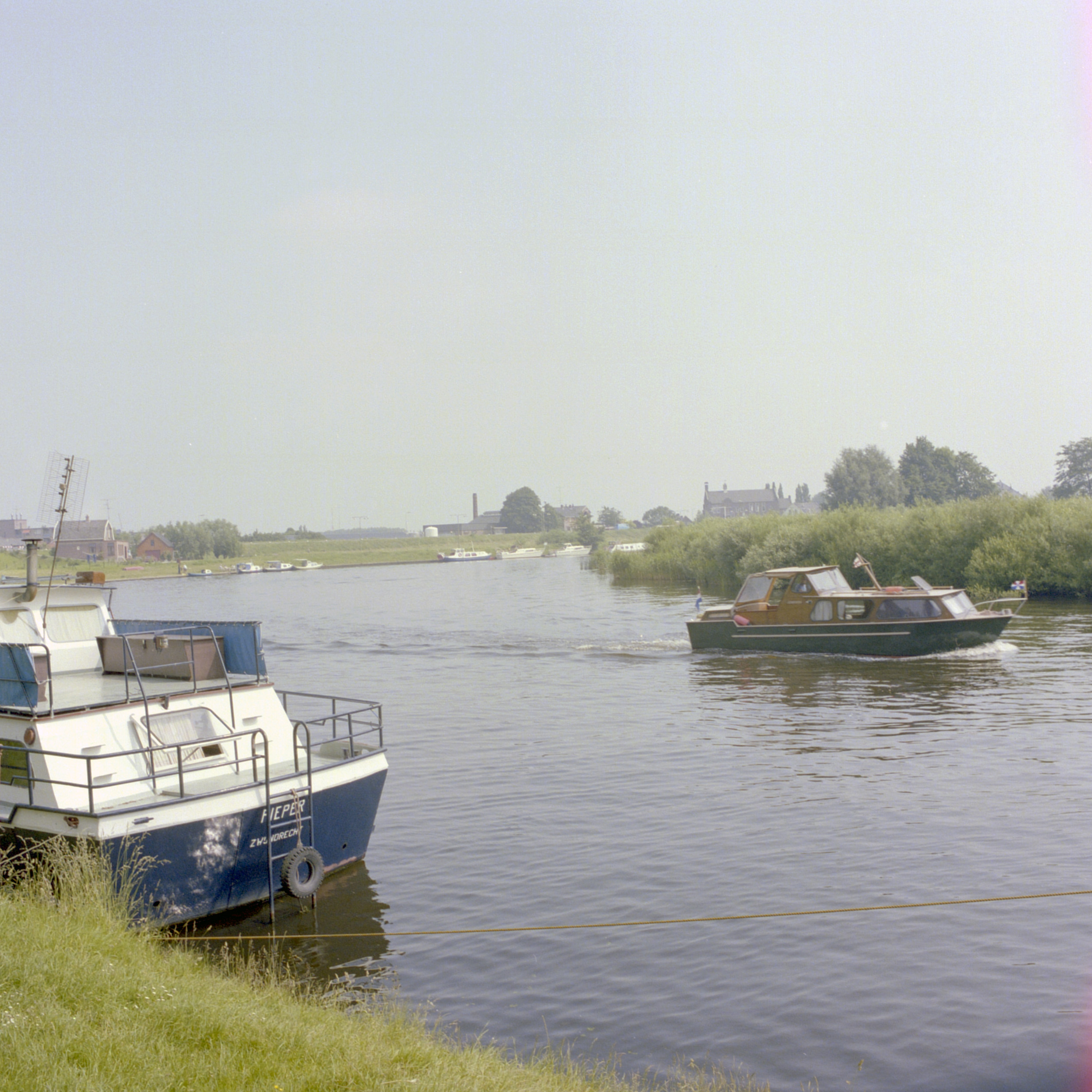 - De Linge vanaf de Schoolstraat in Arkel. Midden op de achtergrond de melkfabriek, rechts daarvan het raadhuis.