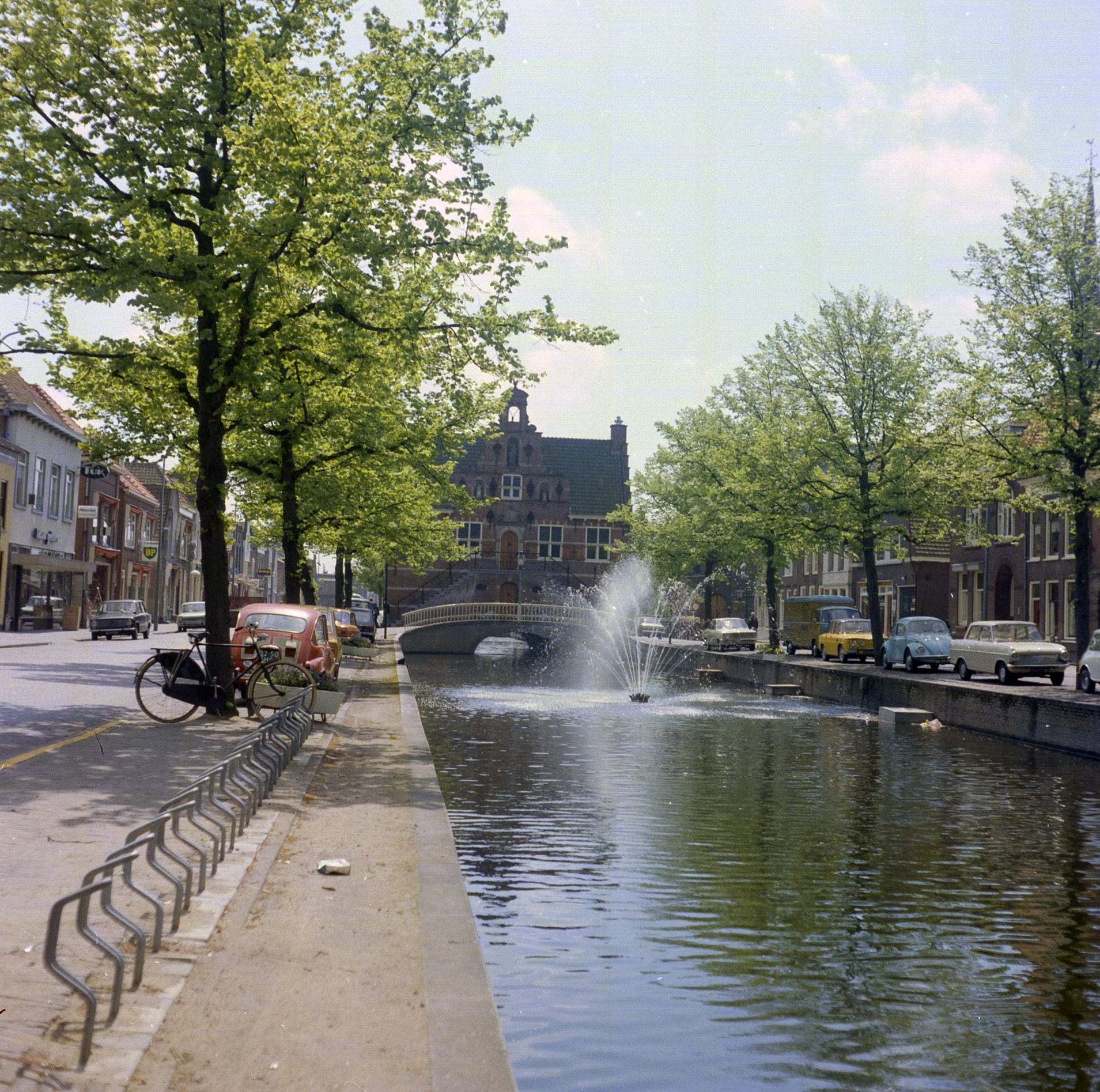 - Links de Oost-Voorstraat, rechts de West-Voorstraat langs de Vliet in Oud-Beijerland, gezien in de richting van het raadhuis.