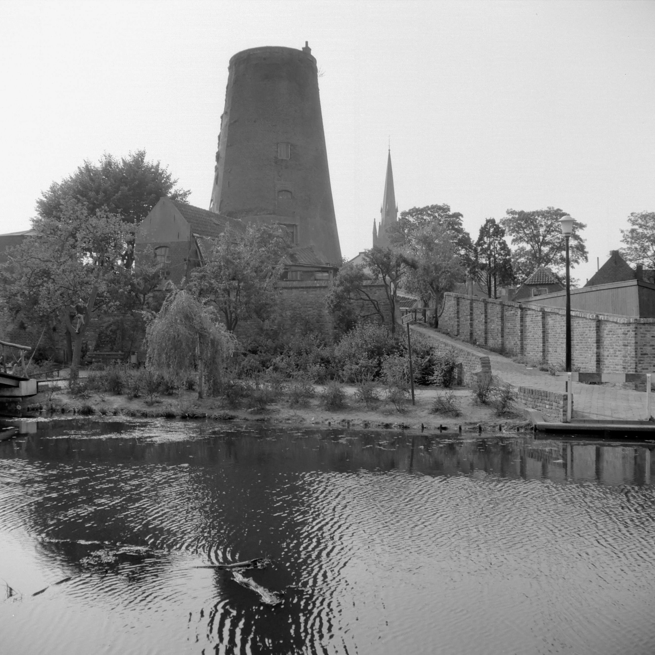 - Romp van molen De Windotter aan de Walkade, gezien over de Stadsgracht in IJsselstein. De kerktoren is de Sint Nicolaasbaseliek.
