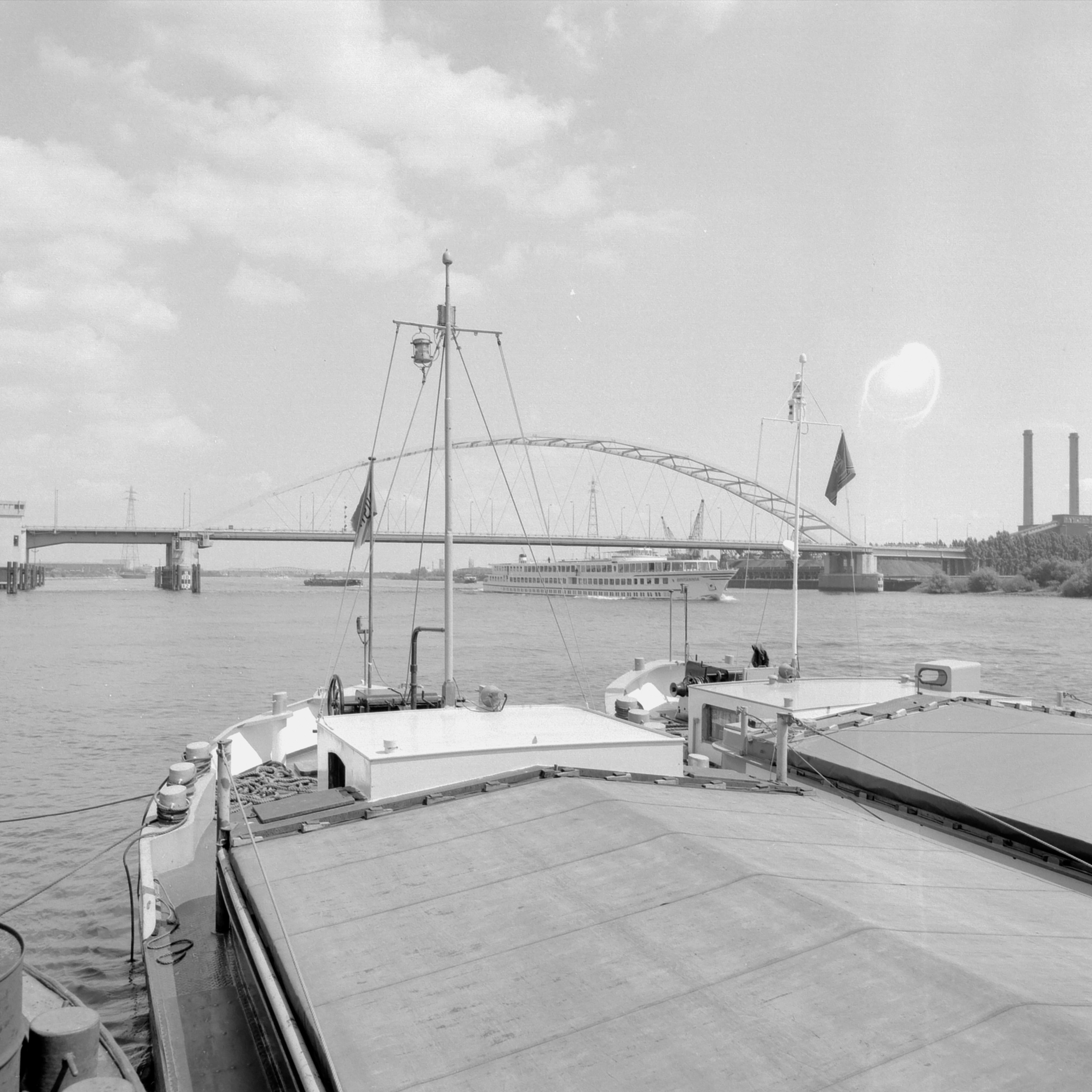 - De Merwedebrug over de Beneden Merwede, gezien naar het oosten. Rechts de schoorstenen van de Merwedecentrale.