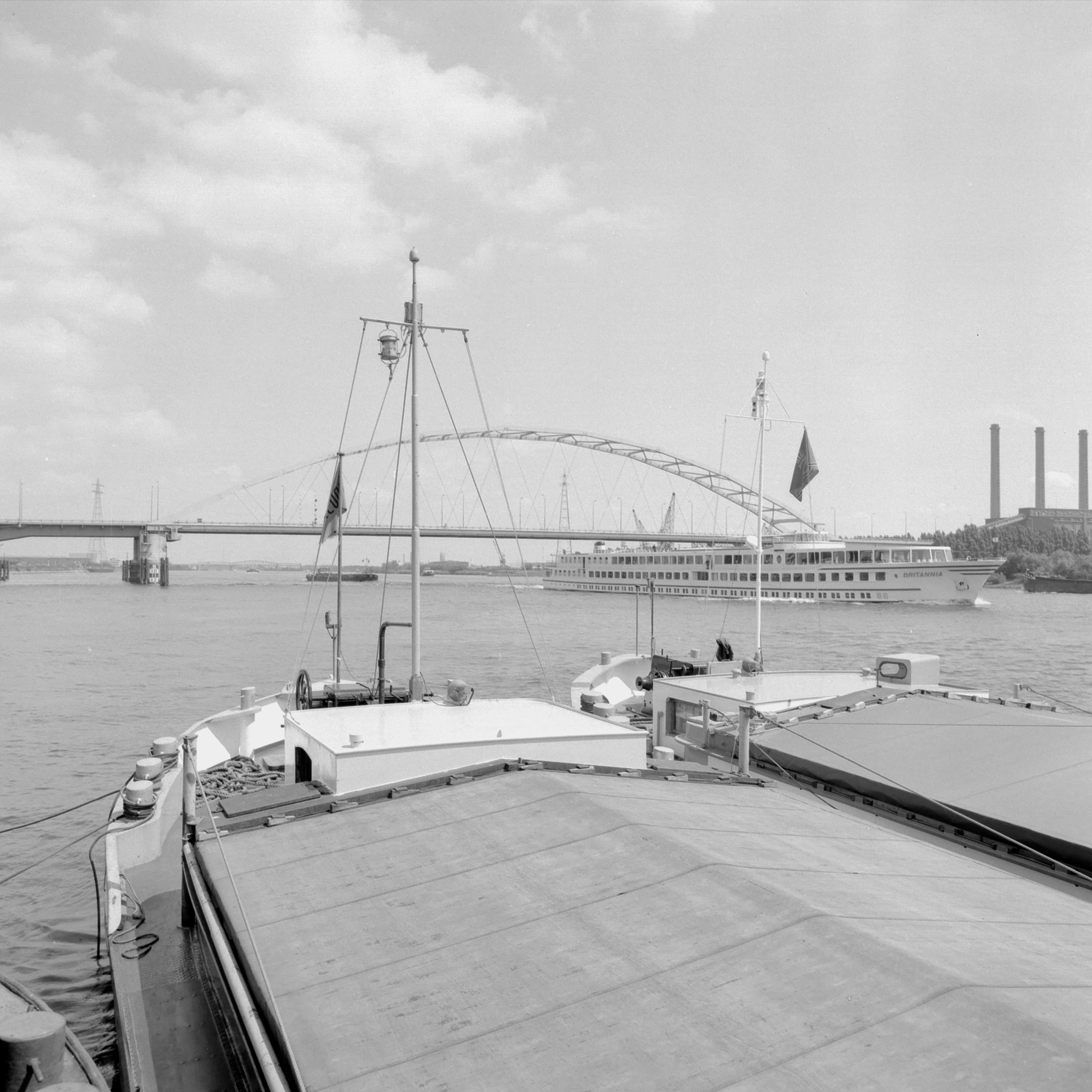 De Merwedebrug over de Beneden Merwede, gezien naar het oosten. Rechts de schoorstenen …