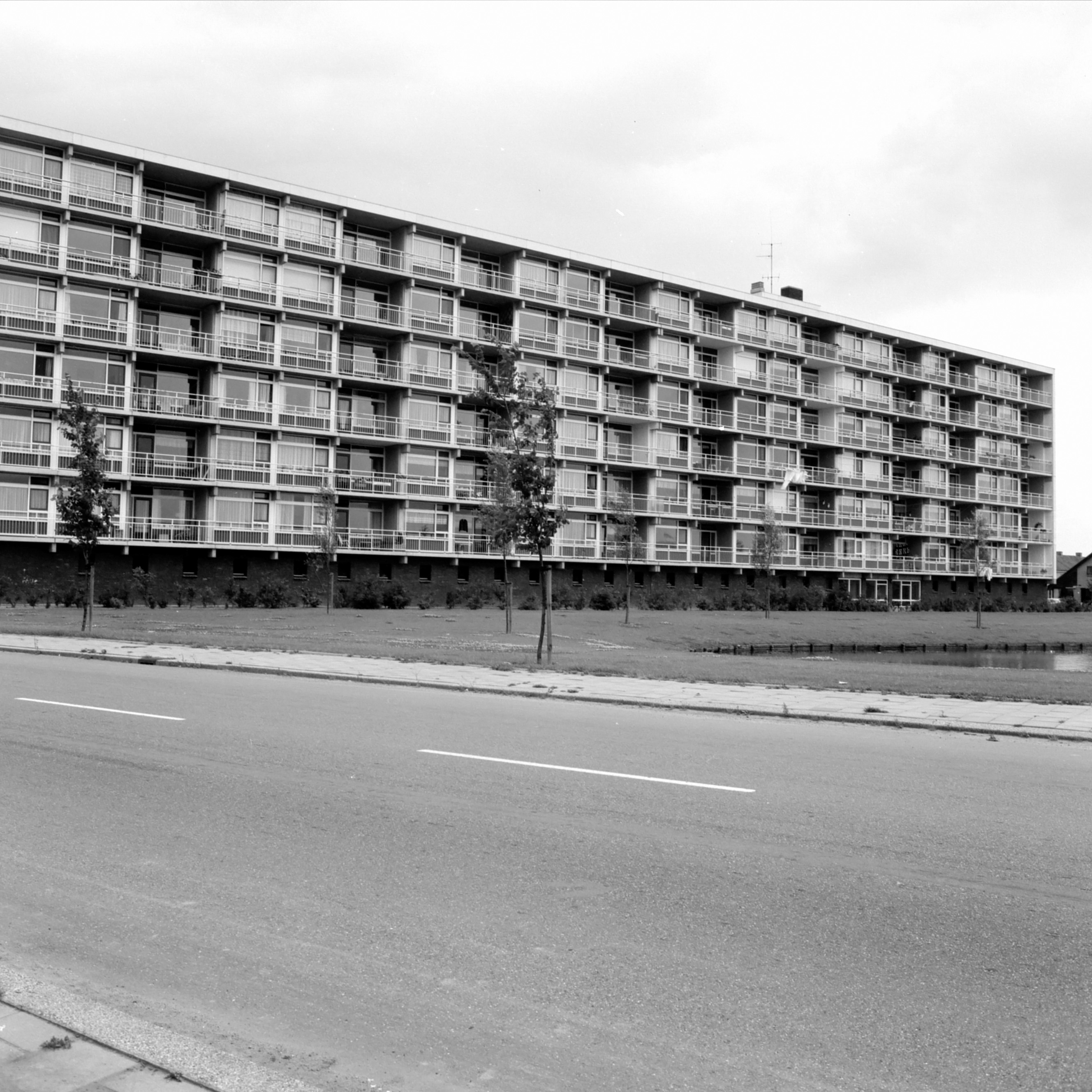 Flatgebouw aan het Ooievaarplein gezien vanaf de Merelstraat in Zwijndrecht.
