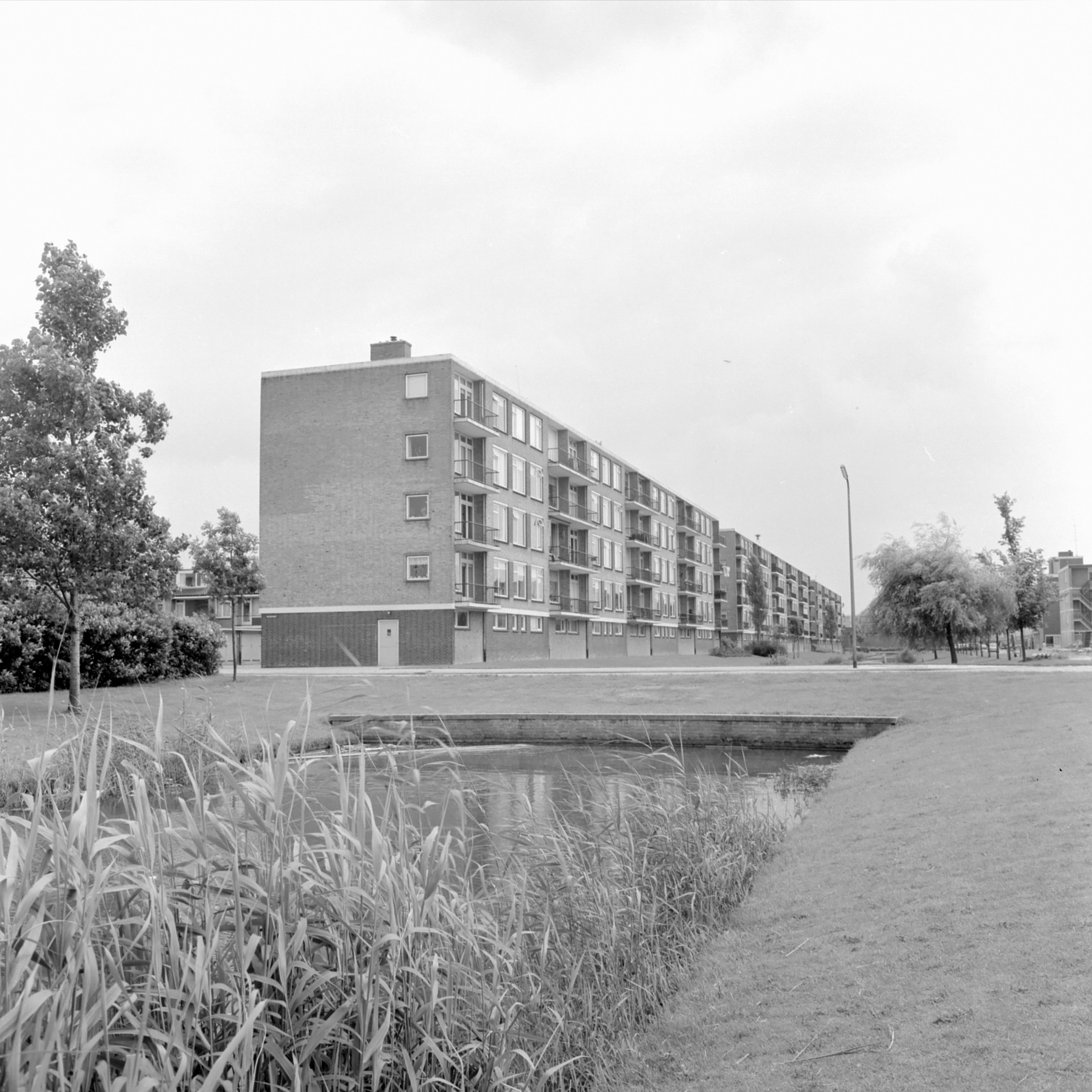- Flats aan de Dahliastraat gezien aan de zijde van de Anemoonlaan richting Narcisstraat in Zwijndrecht.
