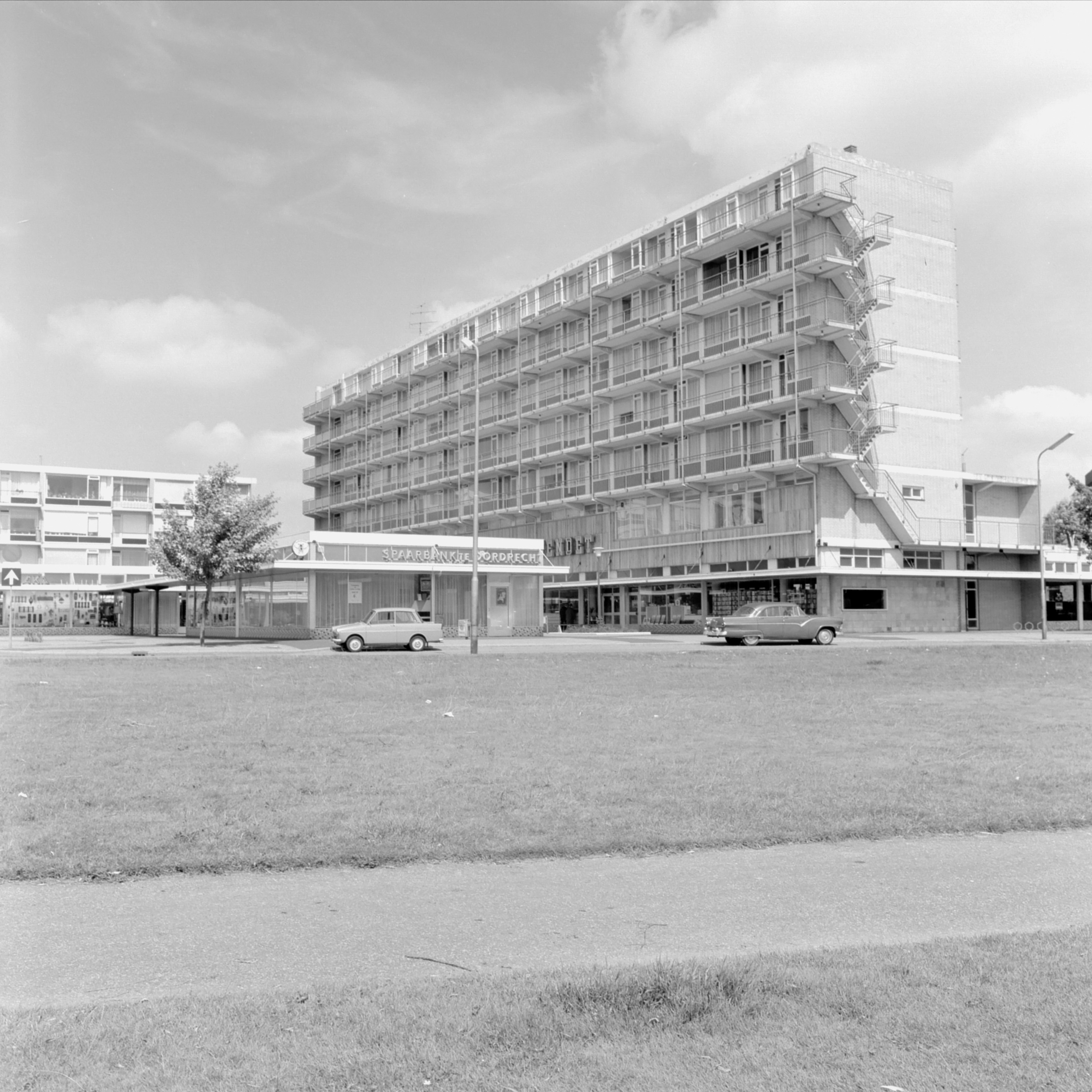 - Flat aan de Hoveniersstraat, gezien vanaf de Burgemeester Jansenlaan in Zwijndrecht. Links Winkelboulevard Noord.