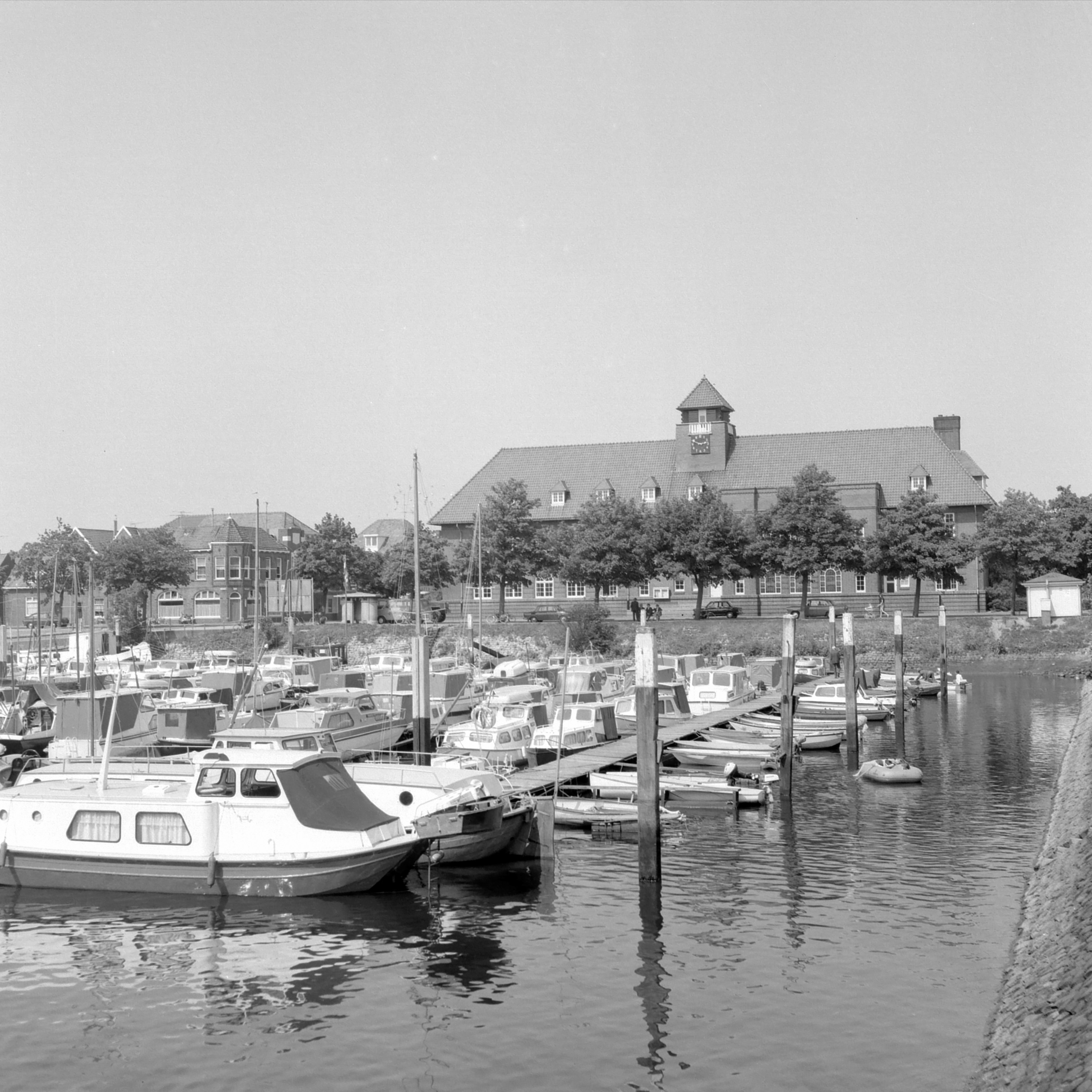 Jachthaven gezien vanaf de Merwestraat richting het raadhuis van Sliedrecht.