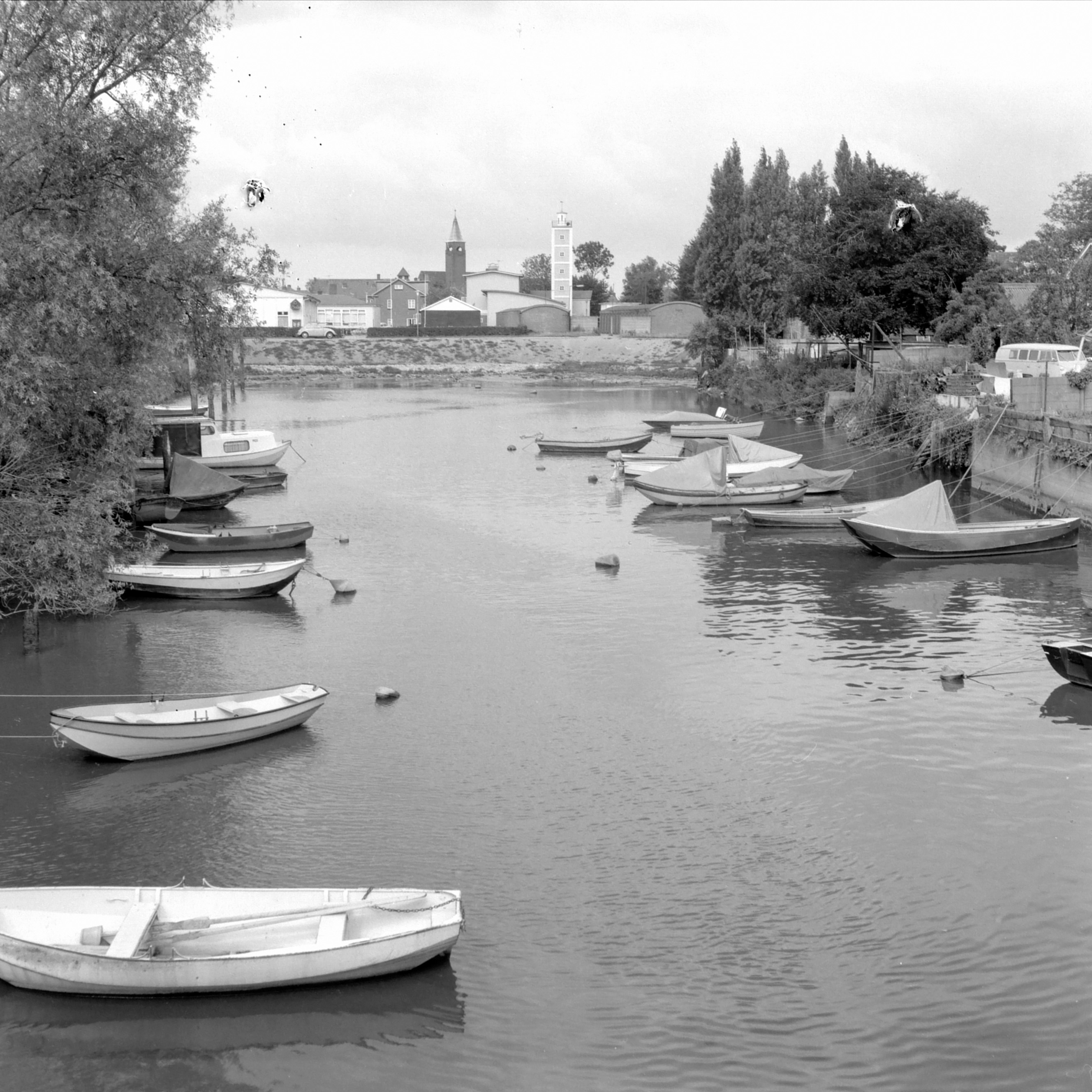 - Het Middeldiep in Sliedrecht, gezien richting Middeldiepstraat met de Gereformeerde Kerk en de droogtoren van de brandweerkazerne.