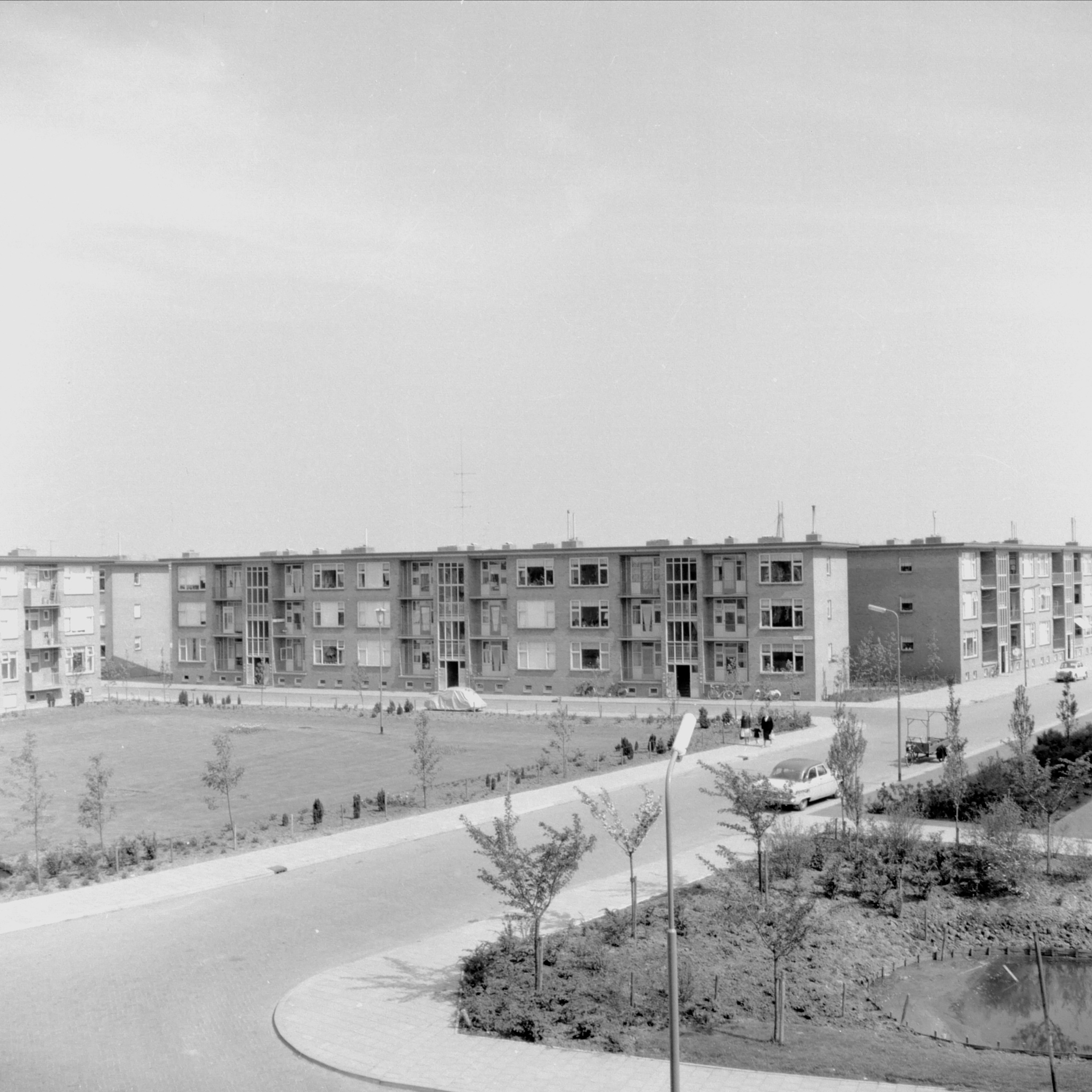 Op de voorgrond is de Rembrandlaan met halverwege links de Prof.Kamerlingh Onneslaan in Sliedrecht gezien in Oostelijke richting.