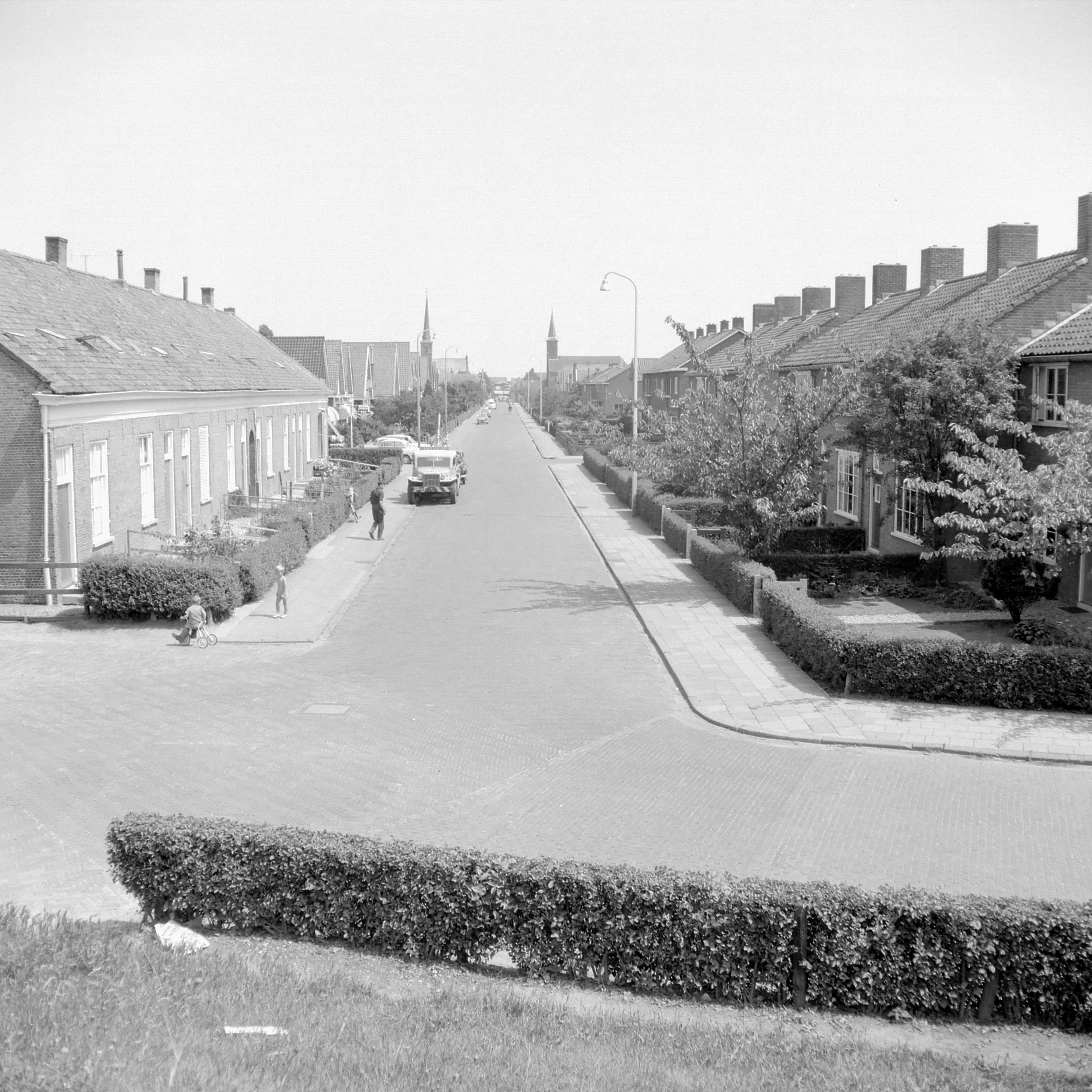 Karel Doormanstraat vanaf de Jan van Galenstraat in Oud-Beijerland. Links de Dorpskerk, …