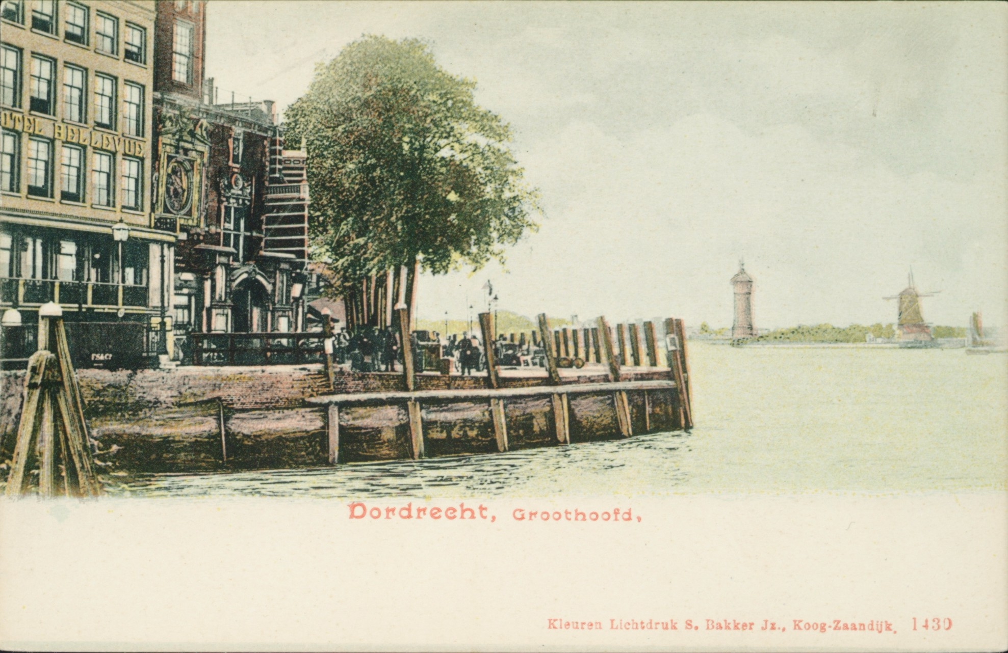 - Groothoofd met op de achtergrond de watertoren en de houtzaagmolen op Zwijndrecht. omstreeks 1900.