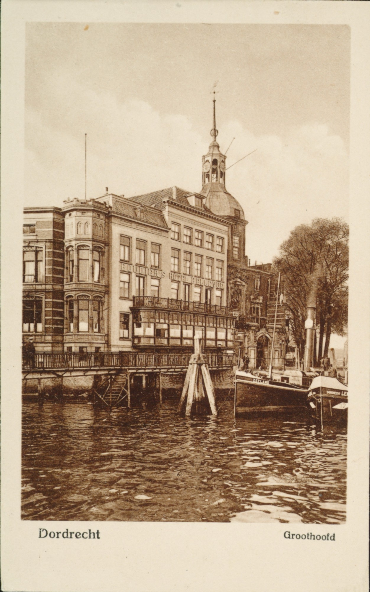 - Groothoofd met de Groothoofdspoort en Boudier's hotel "Bellevue"vanaf de rivier gezien. Ca. 1914.