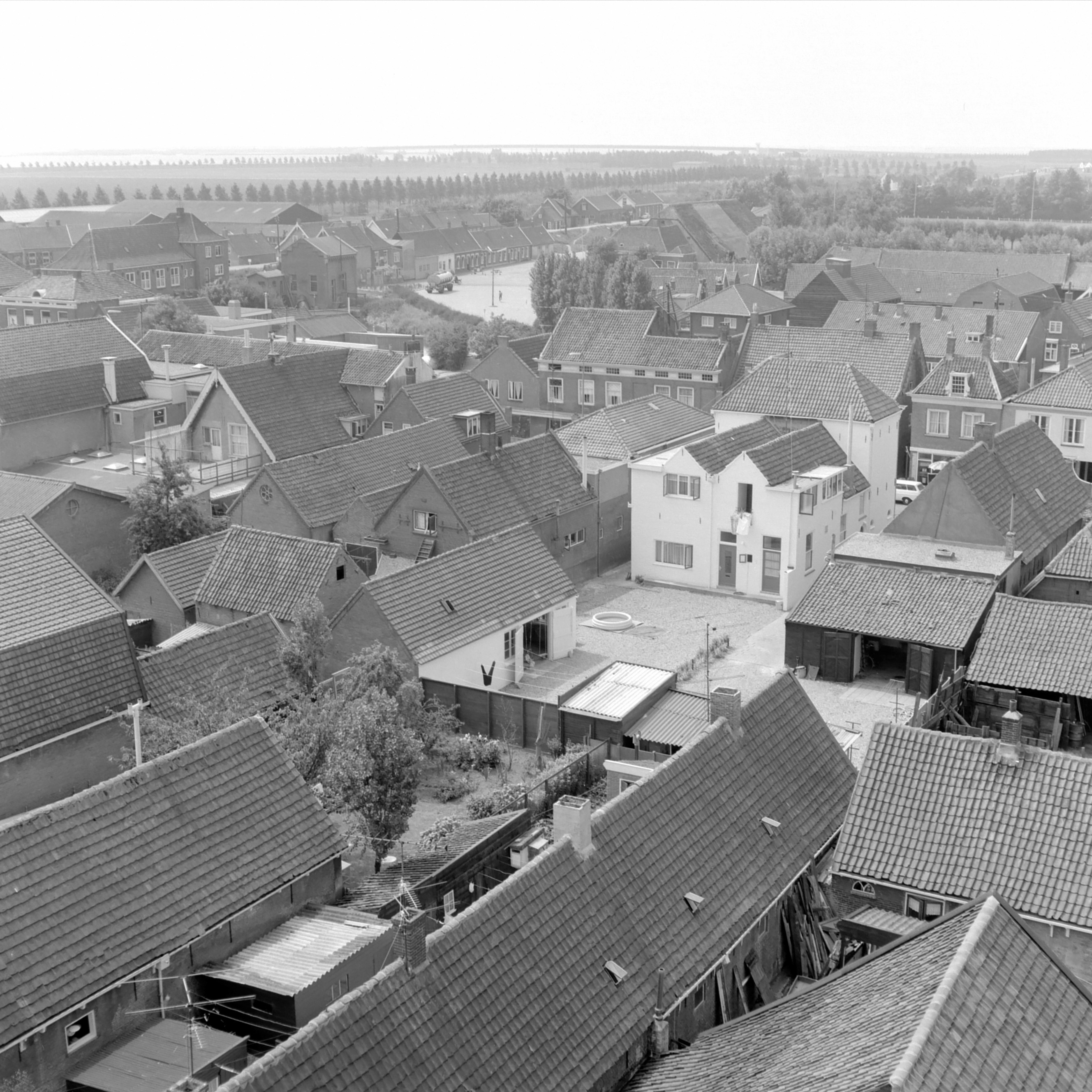 - Panorama vanaf de kerktoren aan de Torenstraat op Numansdorp en de Haringvlietbrug op de achtergrond.