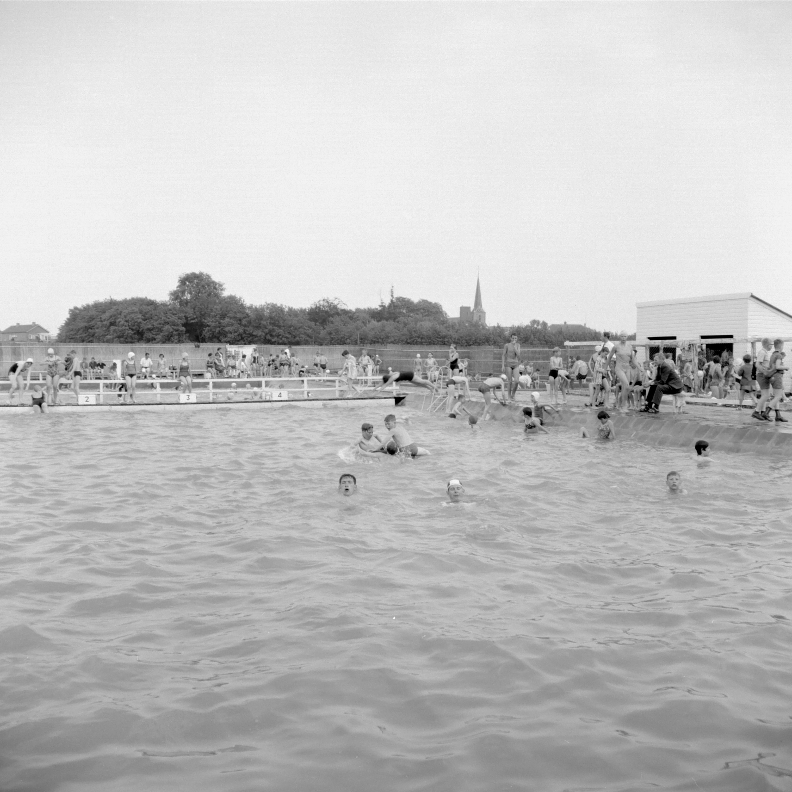 Openluchtzwembad De Keen nabij de Nieuwestraat in Strijen. Midden op de achtergrond de …