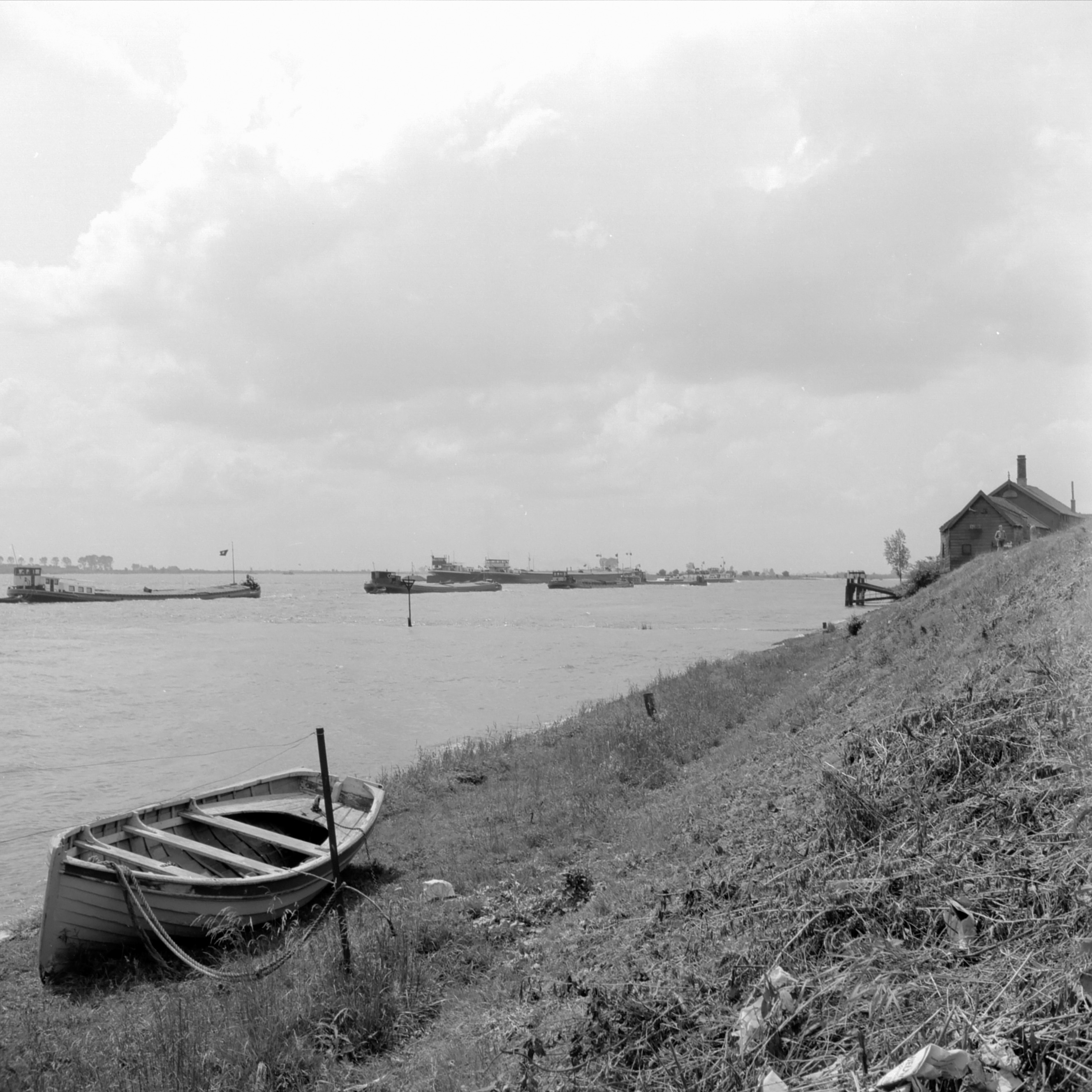Aanlegplaats van het veer Hardinxveld-Werkendam aan de Rivierdijk in Boven-Hardinxveld. Zicht op de splitsing van Boven Merwede naar de Beneden Merwede en Nieuwe Merwede (links).
