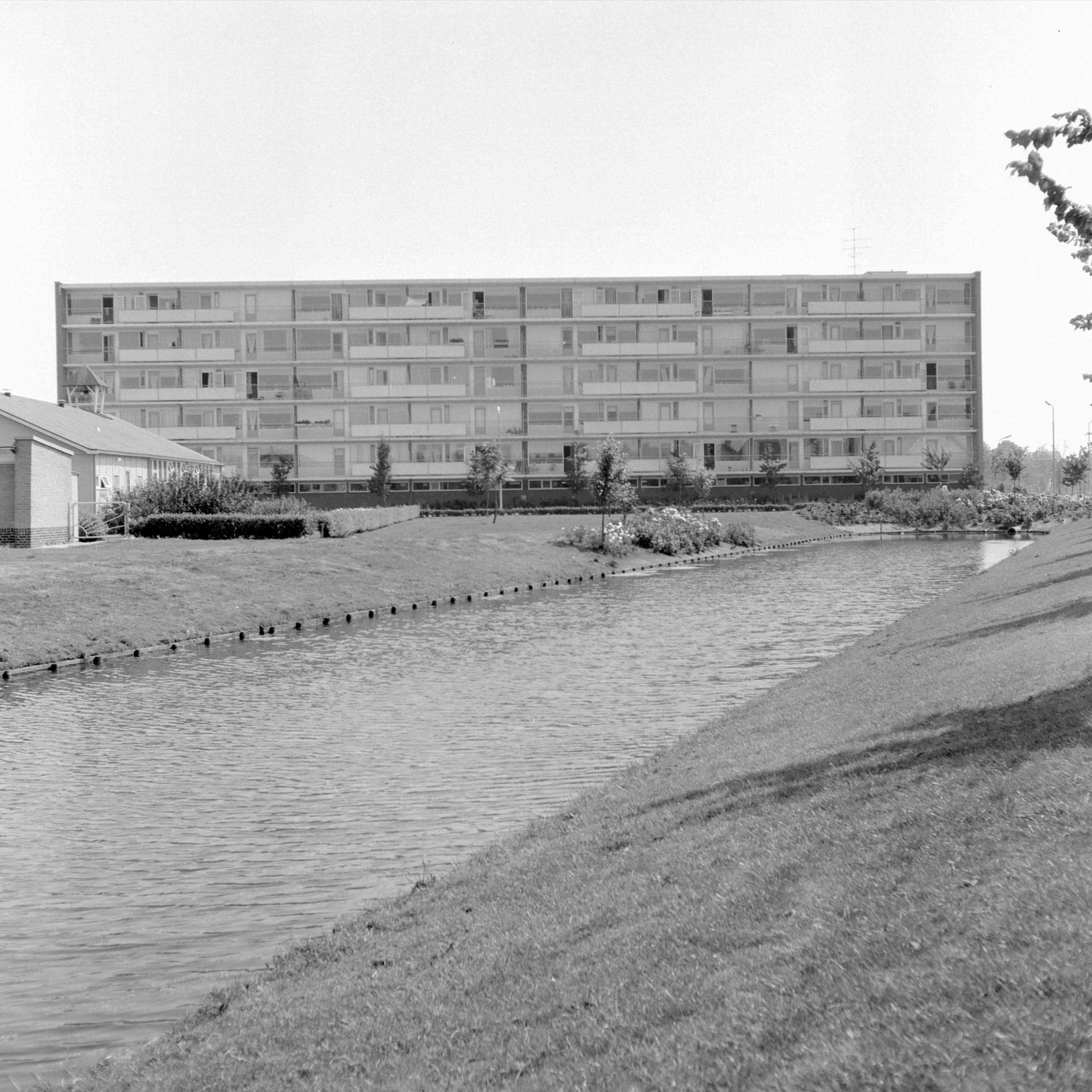 Woonflat aan de Lijsterweg gezien vanaf de Rembrandlaan in Sliedrecht. Geheel links de …