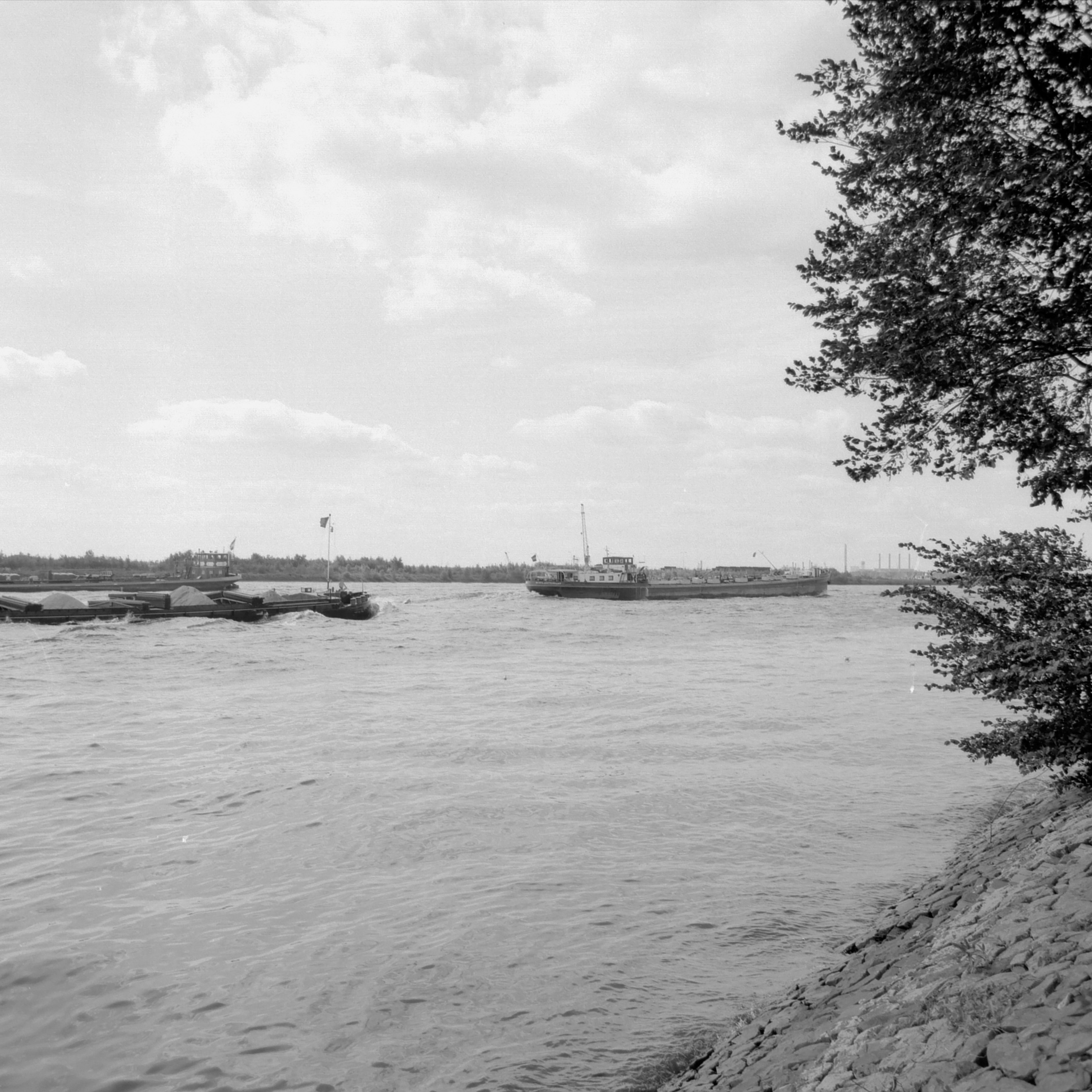 Beneden Merwede vanaf de hoek Adriaan Volkersingel thv restaurant Bellevue met de Dordtse centrale op de achtergrond. in Sliedrecht.