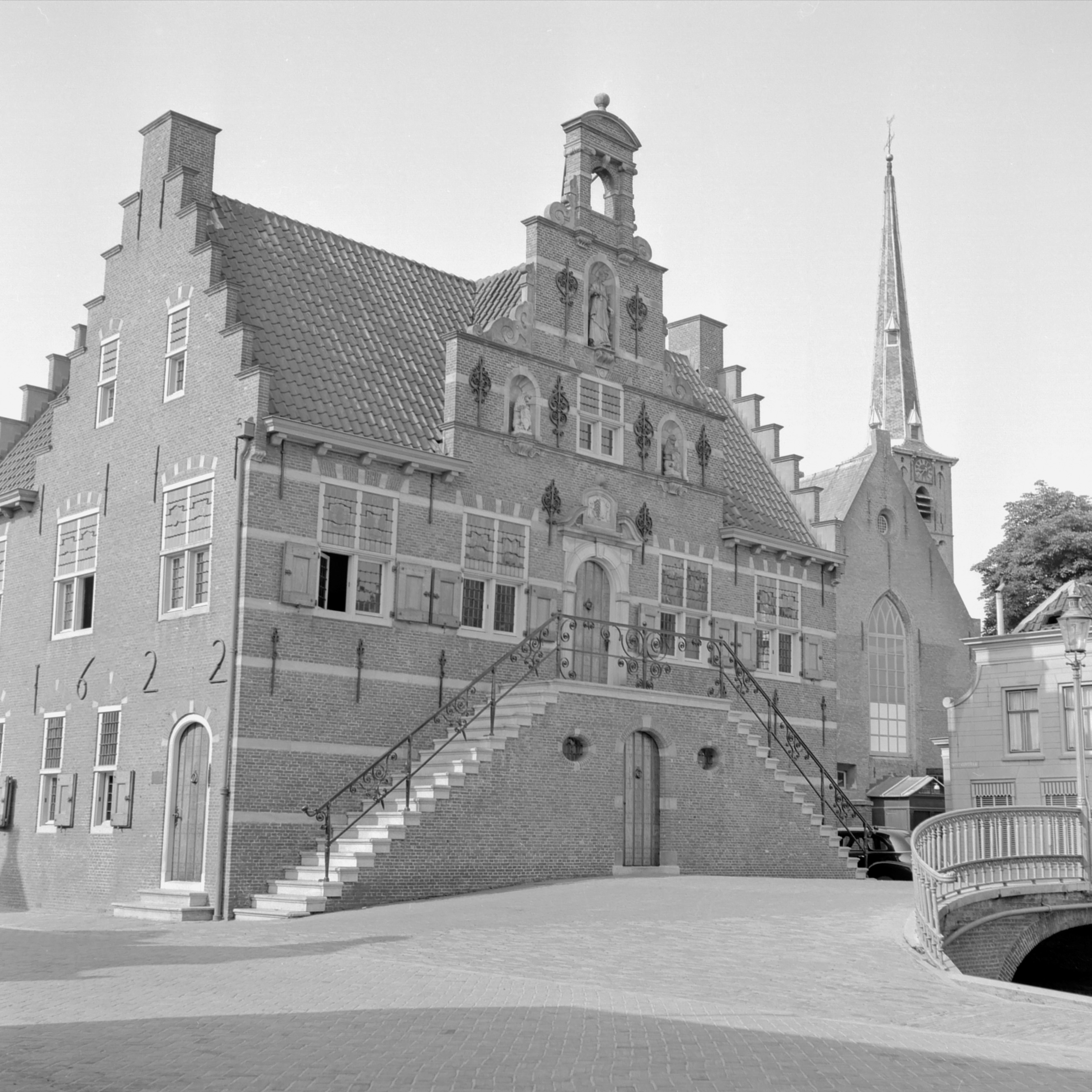 Raadhuis van Oud-Beijerland, gezien vanaf de Oost-Voorstraat Rechts staat de Dorpskerk.