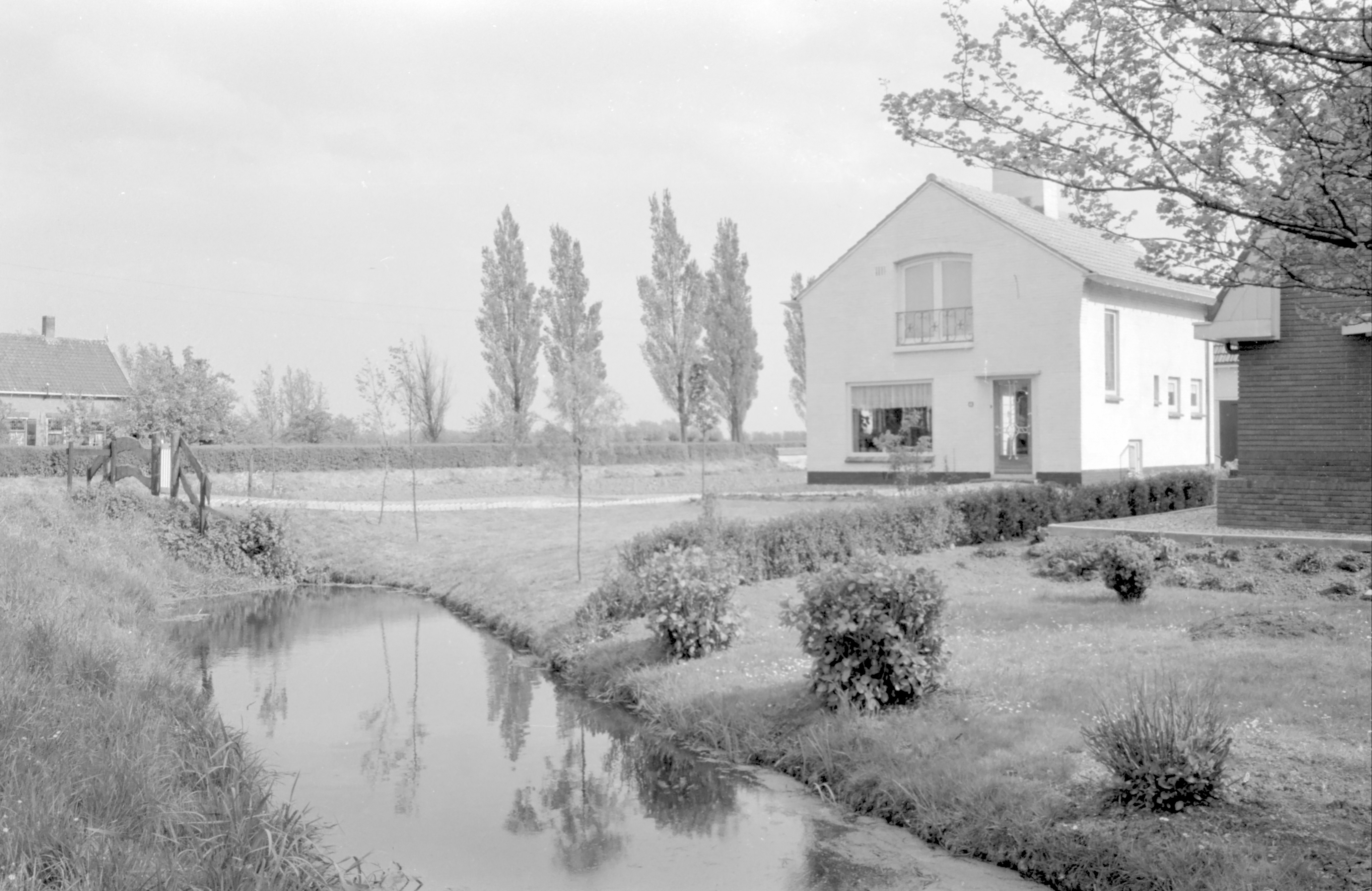 Westeinde thv nr 34 (wit huis) met de Veerweg erachter in Oud Alblas.